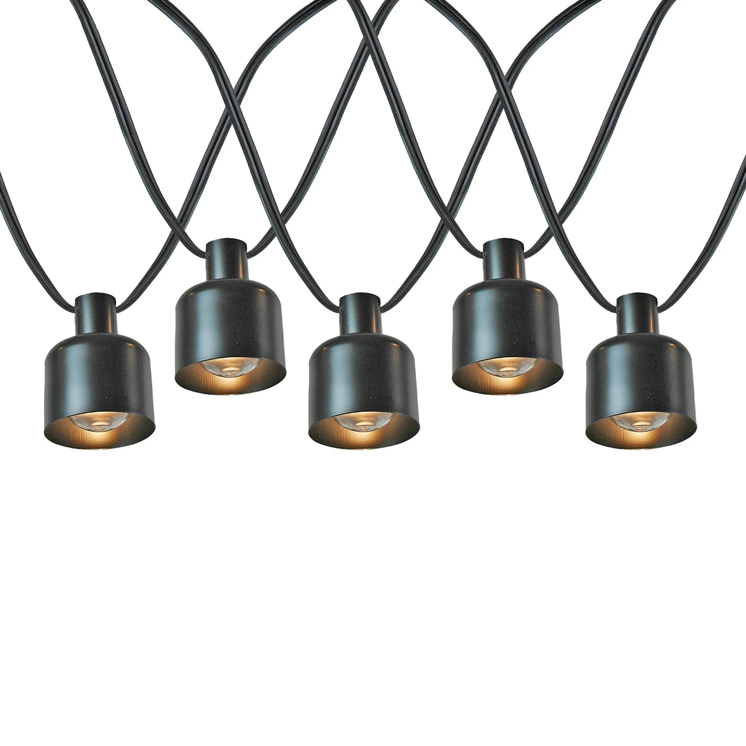Novelty Lights Warm White LED filament gas can lampshade G40 globe string light sets with 10 bulbs, perfect for illuminating your outdoor garden, patio, deck, yard, or special event space. This unique LED G40 outdoor string light set comes with 10 gas can style lampshades on each socket. Each set includes 10 round shatterproof plastic G40 globe bulbs, 1 – 11 foot Black wire stringer with 10 gas can lampshades that are spaced 12″ apart. String together up to 72 sets to meet the needs of your particular application. These Warm White LED G40 globe light strings have long-lasting 10,000 hour bulbs and are on a 20 gauge Black wire. These durable and heavy duty light strings will provide you with years of maintenance-free use.