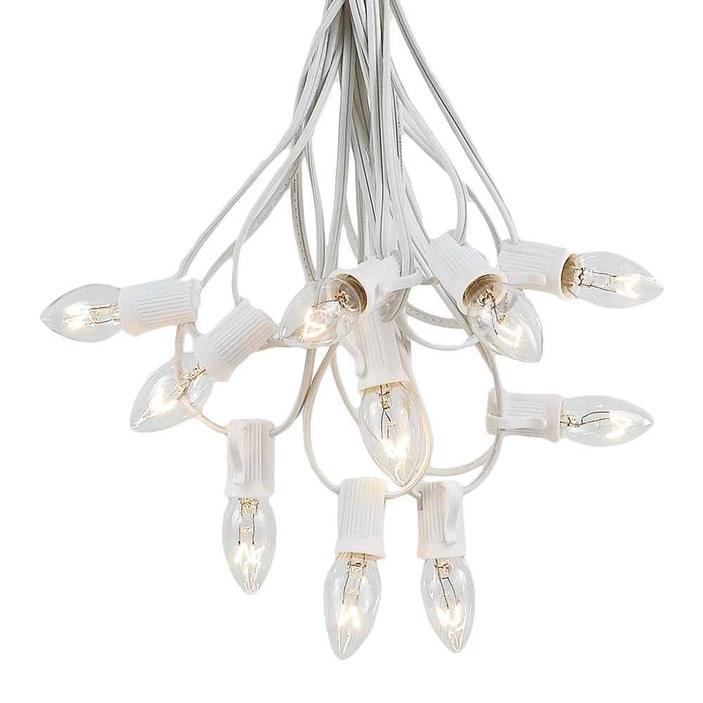 Buy Novelty Lights clear 100 C7 Christmas light sets to illumiate your outdoor garden, patio, deck, roofline, trees, or walkway for Christmas or any special event. Each set includes 125 traditional C7 Christmas light bulbs and a 100 foot heavy-duty white wire stringer with 100 sockets that are spaced 12″ apart. With 125 bulbs, these sets include 25 extra bulbs at an excellent value. Novelty Lights clear C7 Christmas string light sets have long-lasting 3000 hour bulbs and are on a durable 20 gauge white wire. All of our C7 light cords use patented Admiral Brand sockets. These durable and heavy duty string lights will provide you with years of easy, maintenance-free use.