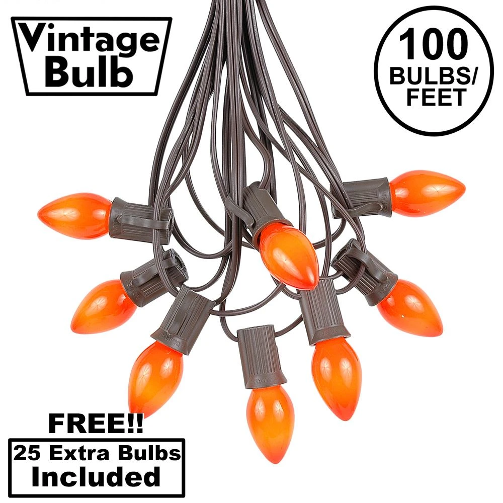 Buy Novelty Lights Vintage Style Orange Ceramic 100 C7 Christmas light sets to illumiate your outdoor garden, patio, deck, roofline, trees, or walkway for Christmas or any special event. Each set includes 125 painted glass C7 Christmas light bulbs and a 100 foot heavy-duty brown wire stringer with 100 sockets that are spaced 12″ apart. With 125 bulbs, these sets include 25 extra bulbs at an excellent value. Novelty Lights orange opaque C7 Christmas string light sets have long-lasting 3000 hour bulbs and are on a durable 20 gauge brown wire. All of our C7 light cords use patented Admiral Brand sockets. These durable and heavy duty string lights will provide you with years of easy, maintenance-free use.