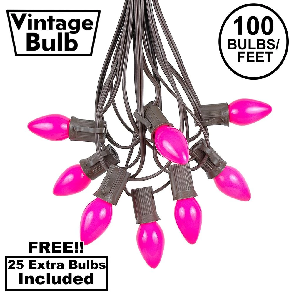 Buy Novelty Lights Vintage Style Pink Ceramic 100 C7 Christmas light sets to illumiate your outdoor garden, patio, deck, roofline, trees, or walkway for Christmas or any special event. Each set includes 125 painted glass C7 Christmas light bulbs and a 100 foot heavy-duty brown wire stringer with 100 sockets that are spaced 12″ apart. With 125 bulbs, these sets include 25 extra bulbs at an excellent value. Novelty Lights pink opaque C7 Christmas string light sets have long-lasting 3000 hour bulbs and are on a durable 20 gauge brown wire. All of our C7 light cords use patented Admiral Brand sockets. These durable and heavy duty string lights will provide you with years of easy, maintenance-free use.