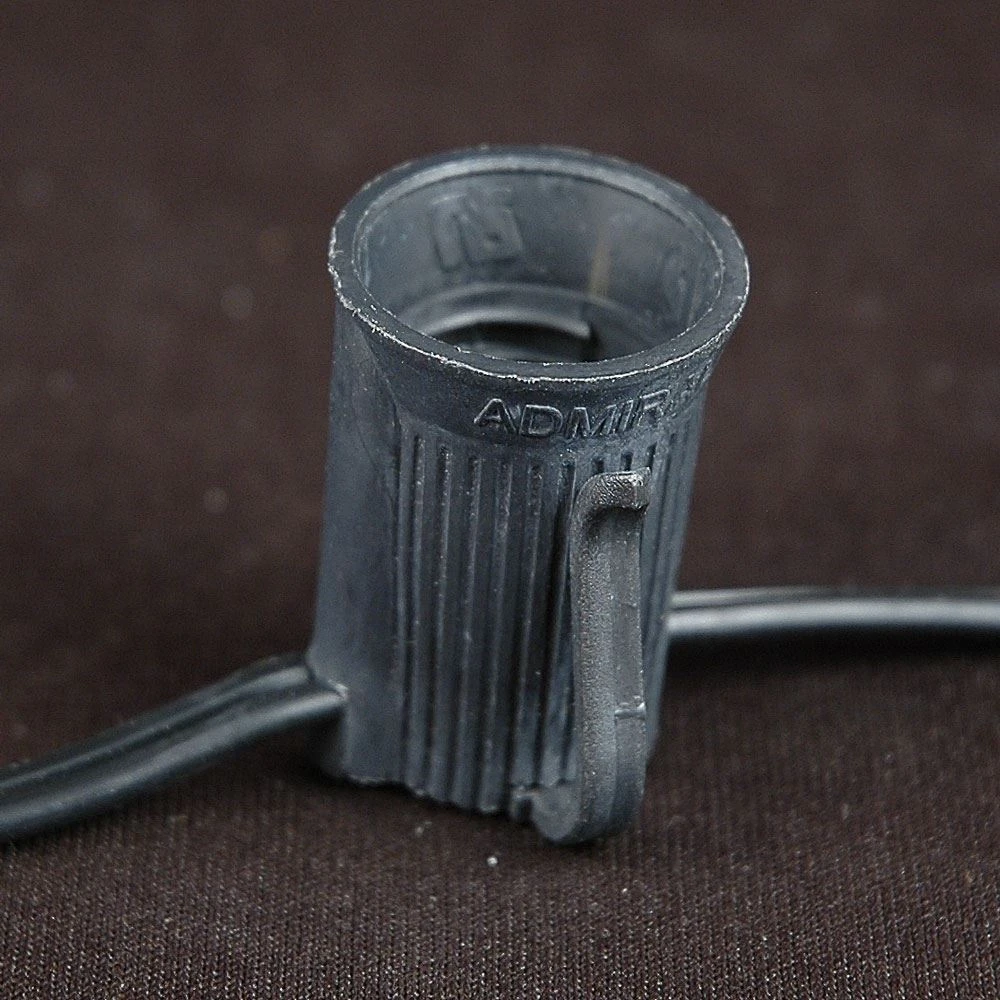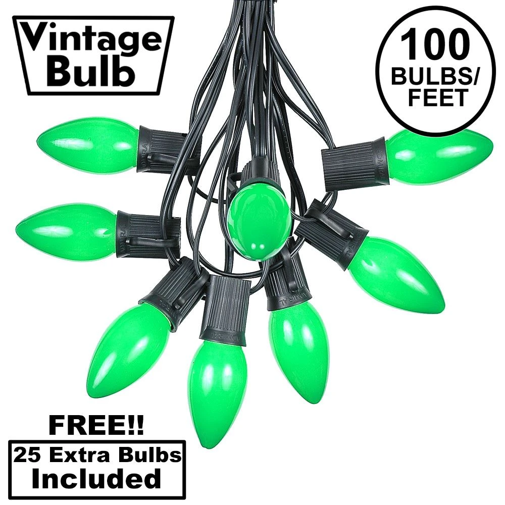 Buy Novelty Lights vintage ceramic green C9 string light set with black wire that is 100 feet long. This traditional Christmas light set will make your holiday decorating easy, bright and beautiful. Each set includes 125 C9 ceramic bulbs and a black wire stringer with 100 sockets that are spaced 12″ apart. These hard-to-find painted incandescent Christmas lights will bring you back to your childhood. Novelty Lights ceramic green C9 Christmas light sets have long lasting 3000 hour bulbs and are on a 18 gauge black wire. All of our C9 light strings use patented Admiral Brand sockets. These durable and heavy duty light strings will provide you with years of maintenance free use. Each Set includes 25 FREE replacement bulbs.
