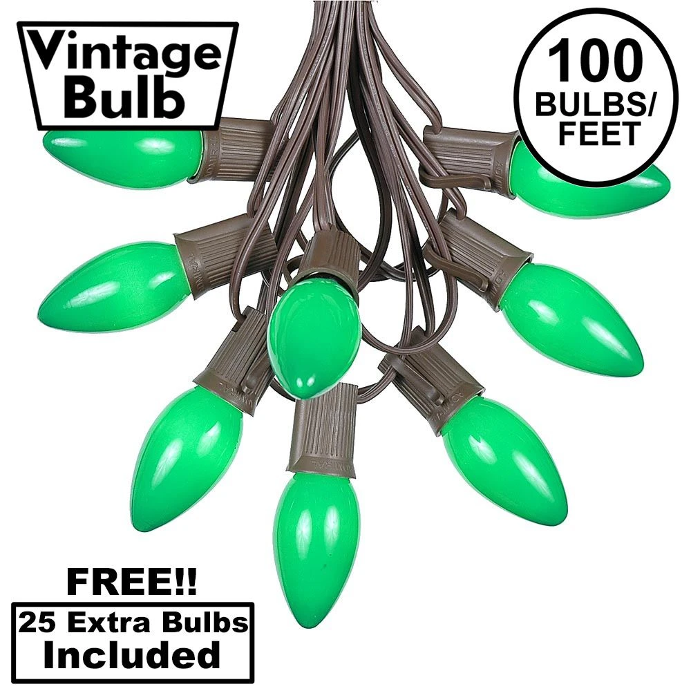 Buy Novelty Lights vintage ceramic green C9 string light set with brown wire that is 100 feet long. This traditional Christmas light set will make your holiday decorating easy, bright and beautiful. Each set includes 125 C9 ceramic bulbs and a brown wire stringer with 100 sockets that are spaced 12″ apart. These hard-to-find painted incandescent Christmas lights will bring you back to your childhood. Novelty Lights ceramic green C9 Christmas light sets have long lasting 3000 hour bulbs and are on a 18 gauge brown wire. All of our C9 light strings use patented Admiral Brand sockets. These durable and heavy duty light strings will provide you with years of maintenance free use. Each Set includes 25 FREE replacement bulbs.