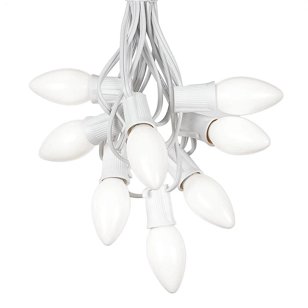 Buy Novelty Lights vintage ceramic white C9 string light set with white wire that is 100 feet long. This traditional Christmas light set will make your holiday decorating easy, bright and beautiful. Each set includes 125 C9 ceramic bulbs and a white wire stringer with 100 sockets that are spaced 12″ apart. These hard-to-find painted incandescent Christmas lights will bring you back to your childhood. Novelty Lights ceramic white C9 Christmas light sets have long lasting 3000 hour bulbs and are on a 18 gauge white wire. All of our C9 light strings use patented Admiral Brand sockets. These durable and heavy duty light strings will provide you with years of maintenance free use. Each Set includes 25 FREE replacement bulbs.
