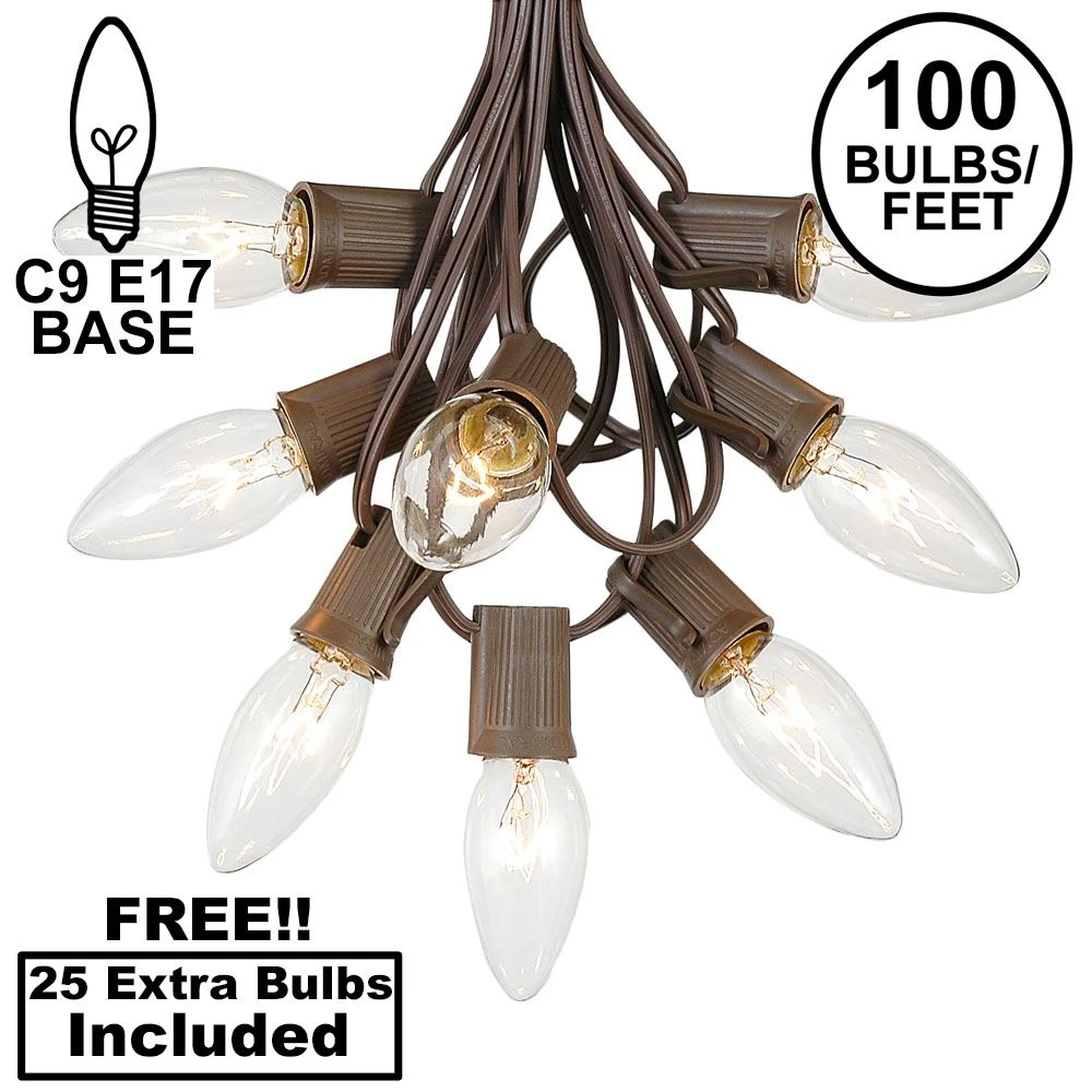 Buy Novelty Lights clear C9 string light set with brown wire that is 100 feet long and will make your holiday decorating easy, bright and beautiful. Each set includes 125 C9 bulbs and a brown wire stringer with 100 sockets that are spaced 12″ apart. These clear C9 Christmas light sets have long lasting 3000 hour bulbs and are on a 18 gauge brown wire. All our C9 light strings use patented Admiral Brand sockets. These durable and heavy duty light strings will provide you with years of maintenance free use. Each Set includes 25 replacement bulbs.