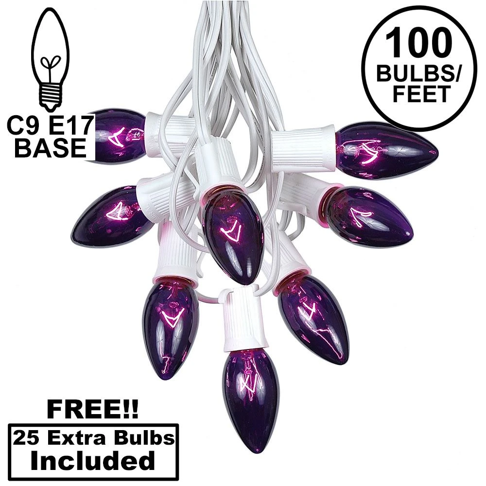 Buy Novelty Lights purple C9 string light set with white wire that is 100 feet long and will make your holiday decorating easy, bright and beautiful. Each set includes 125 C9 bulbs and a white wire stringer with 100 sockets that are spaced 12″ apart. These purple C9 Christmas light sets have long lasting 3000 hour bulbs and are on a 18 gauge white wire. All our C9 light strings use patented Admiral Brand sockets. These durable and heavy duty light strings will provide you with years of maintenance free use. Each Set includes 25 replacement bulbs.