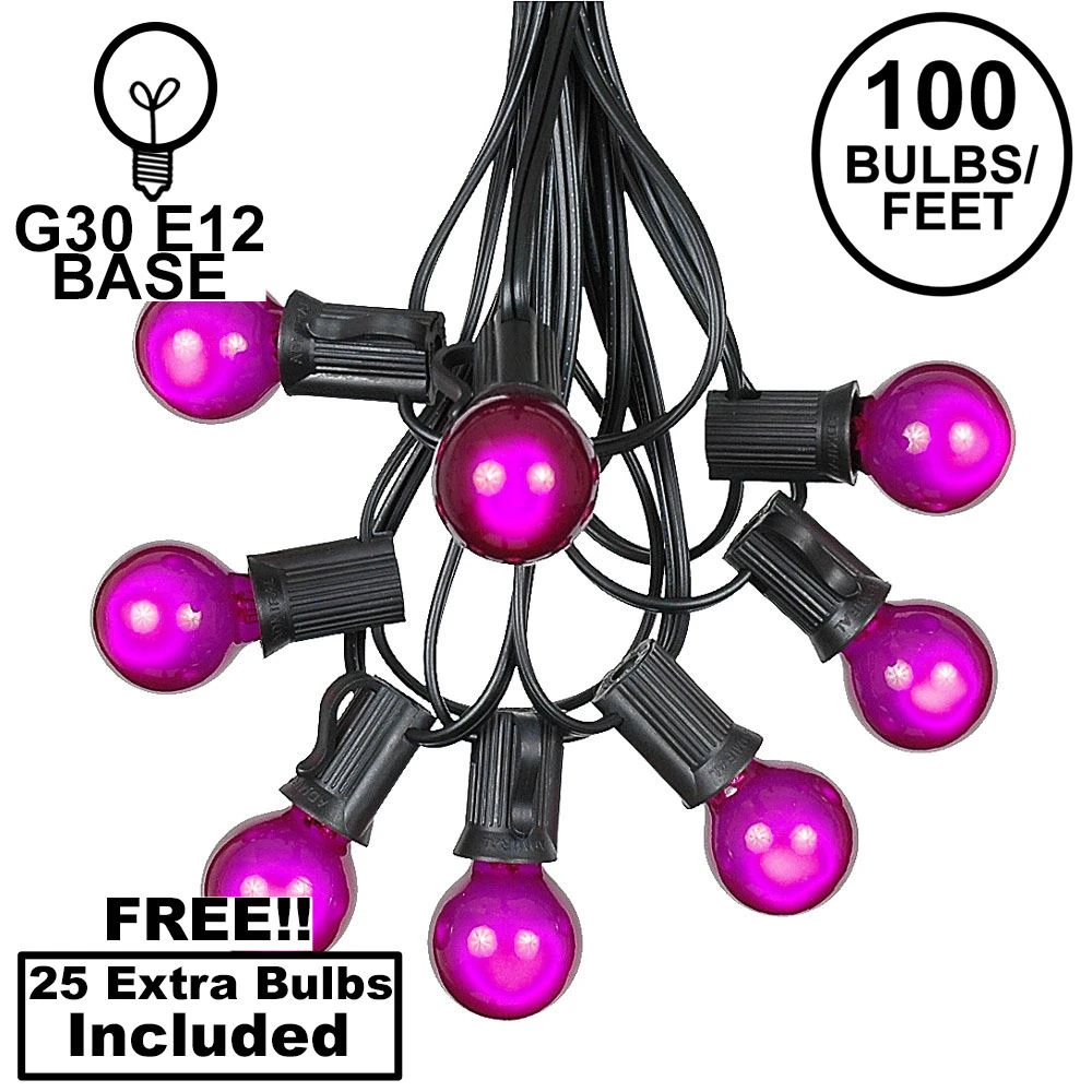 Novelty Lights 100 foot Purple G30 globe string light sets are perfect to illuminate your outdoor garden, patio, deck, yard, or special event space. Each set includes 125 round Purple G30 globe bulbs and a Black 100 foot heavy-duty wire stringer with 100 sockets that are spaced 12″ apart. Our Purple G30 globe string light sets have long-lasting 3000 hour bulbs and are on a durable 20 gauge Black wire. All of our G30 light strings use patented Admiral Brand sockets, and come with 25 extra bulbs for life’s little mishaps. These durable and heavy duty light strings will provide you with years of maintenance-free use.