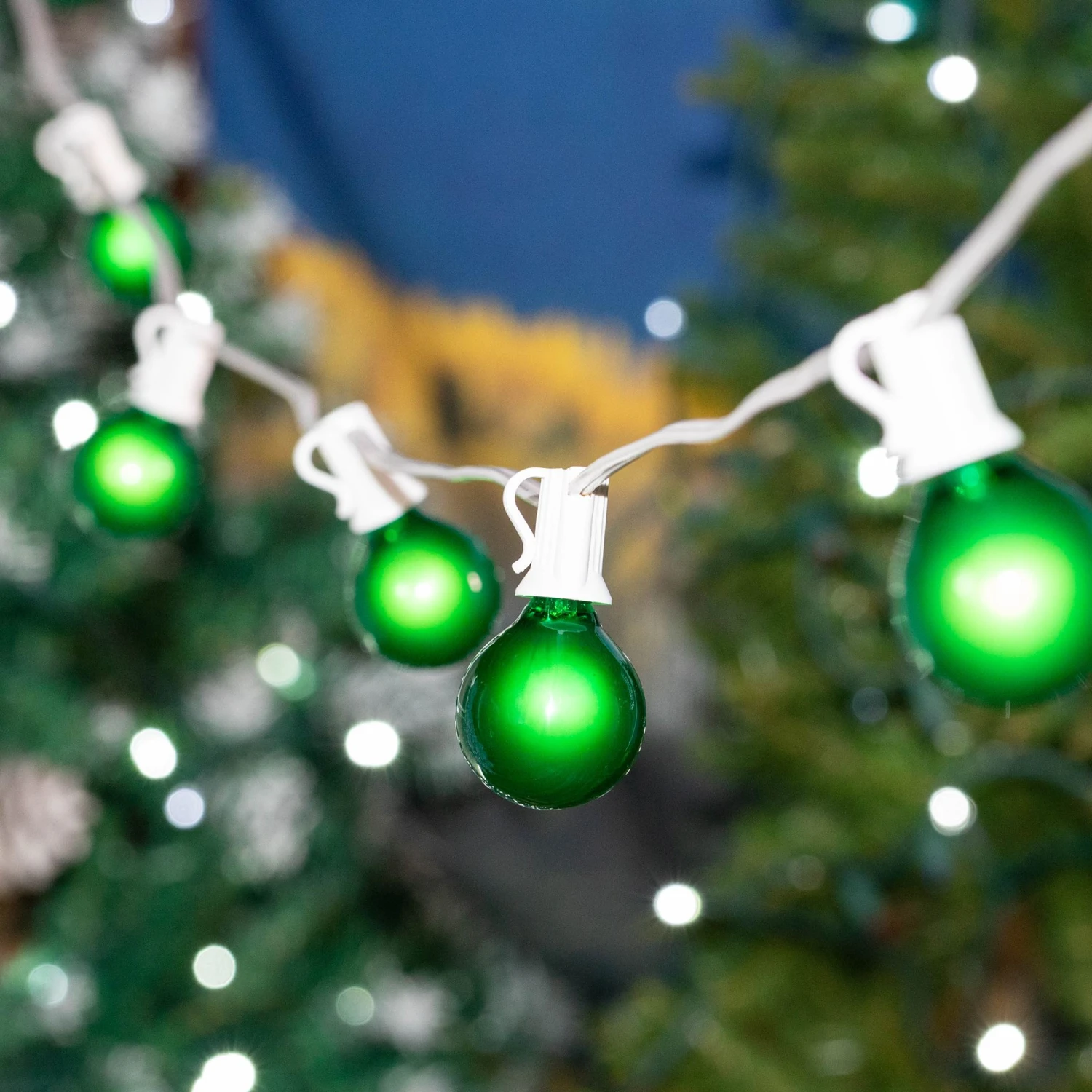 Novelty Lights 100 foot Green G40 globe string light sets are perfect to illuminate your outdoor garden, patio, deck, yard, or special event space. Each set includes 125 round Green G40 globe bulbs and a White 100 foot heavy-duty wire stringer with 100 sockets that are spaced 12″ apart. Our Green G40 globe string light sets have long lasting 3000 hour bulbs and are on a durable 20 gauge White wire. All of our G40 light strings use patented Admiral Brand sockets, and come with 25 extra bulbs for life’s little mishaps. These durable and heavy duty light strings will provide you with years of maintenance-free use.