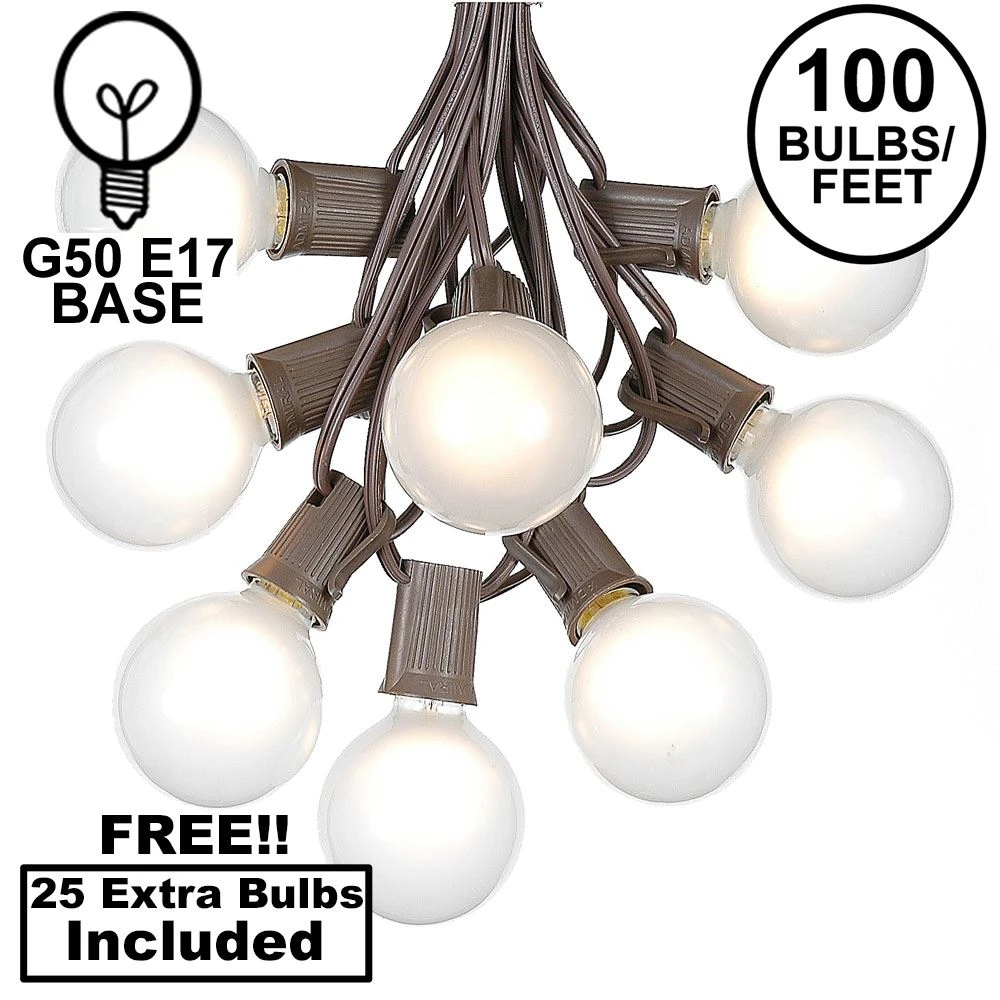 Frosted white G50 globe string light brown wire set that is 100 feet long and perfect for outdoor patios, decks, special event or Christmas lighting. Each set includes 125 round bulbs on a brown wire stringer with 100 sockets that are spaced 12″ apart. These satin white G50 light strings have long lasting 3000 hour bulbs and are on a 18 gauge brown wire. All our g50 light strings use patented Admiral Brand sockets. These durable and heavy duty light strings will provide you with years of maintenance free use. Each Set includes 25 replacement bulbs.