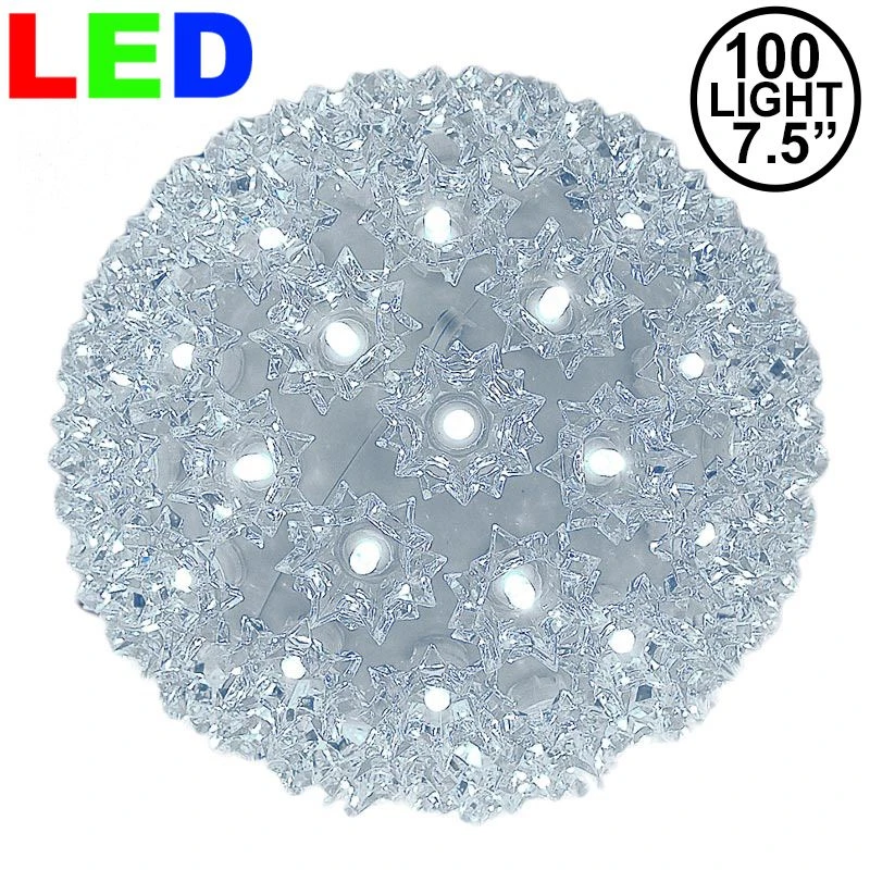 Buy a 100 light pure white LED starlight sphere for both indoor and outdoor use. These durable and energy efficient pure white LED light balls have the same high quality wide angle LED’s that we offer in our commercial grade LED mini lights. These 7.5 inch 100 light pure white LED starlight spheres have a stackable male plug for powering additional spheres and a 12′ lead cord. Mix and match colors and sizes to create unique and energy efficient outdoor light displays this holiday season and for many seasons to come!