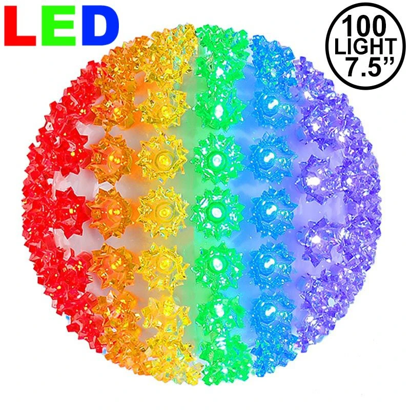 Buy a 100 light Rainbow color LED starlight sphere for both indoor and outdoor use. These durable and energy efficient Rainbow LED Christmas light balls have the same high quality wide angle LED’s that we offer in our commercial grade LED mini lights. These 7.5 inch 100 light red LED starlight spheres have a stackable male plug for powering additional spheres and a 12′ lead cord. Mix and match colors and sizes to create unique and energy efficient outdoor light displays this holiday season and for many seasons to come!
