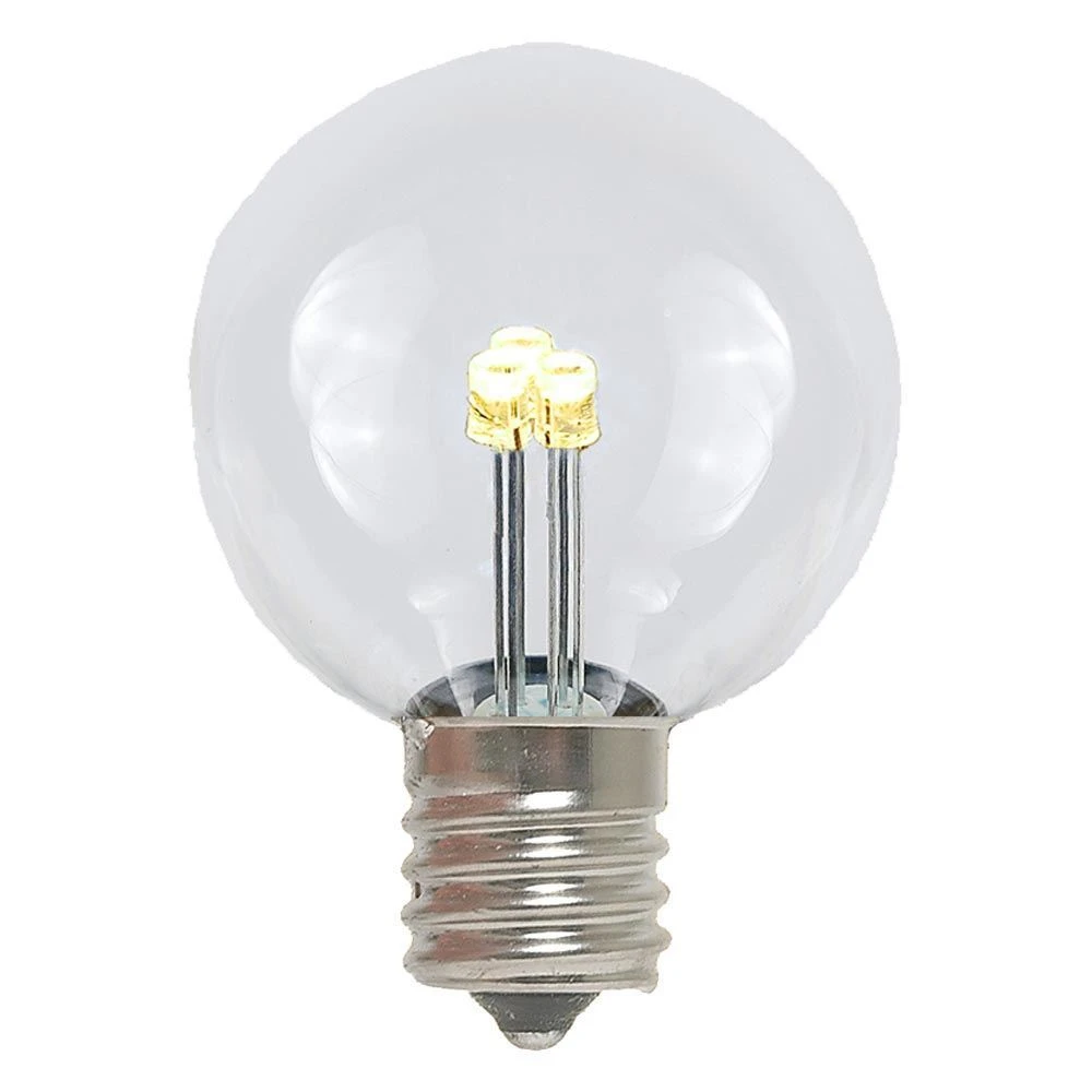 Novelty Lights, Inc. manufactures these durable and heavy duty commercial grade light sets which come with 100 candelabra base sockets spaced 12″ apart on White 16 gauge SPT-2 wire with 100 LED G30 Warm White Bulbs. Using only .50 watt per bulb, these LED G30 bulbs will give you years of beautiful, warm light. This set is not connectable end to end with 100′ on one plug. These strings are perfect for an outdoor patio, special event, restuarant, and Christmas lighting decoration. Each string comes ready to plug in; all you need to do is screw in the light bulbs. Each socket is made of PVC material to create a water tight seal around the globe bulb for extra protection against weathering.