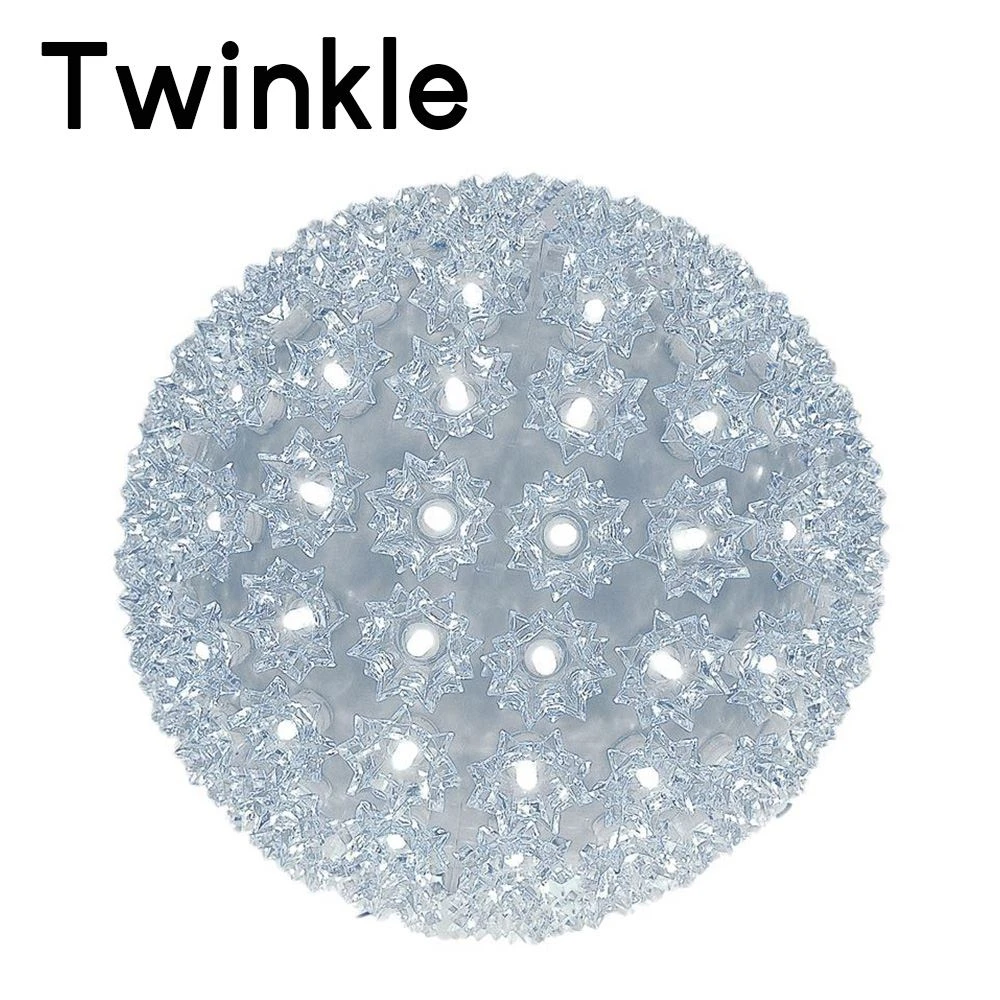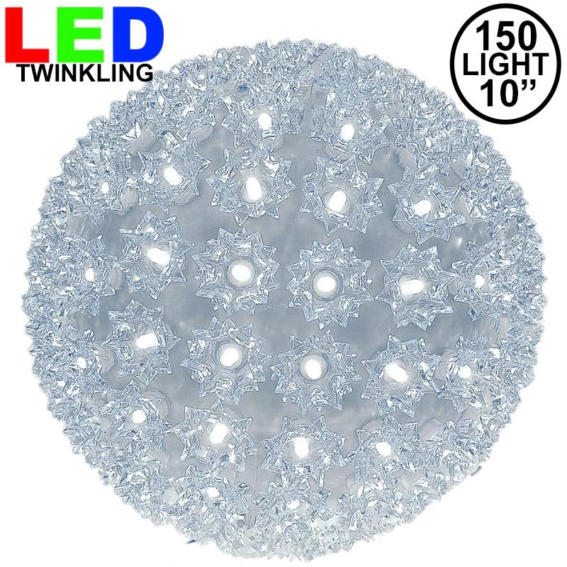 Buy a 150 light pure white twinkling LED starlight sphere for both indoor and outdoor use. These durable and energy efficient pure white LED twinkling light balls have the same high quality wide angle LED’s that we offer in our commercial grade LED mini lights. These 10 inch 150 light pure white LED twinkle starlight spheres have a stackable male plug for powering additional spheres and a 12′ lead cord. Mix and match colors and sizes to create unique and energy efficient outdoor light displays this holiday season and for many seasons to come!