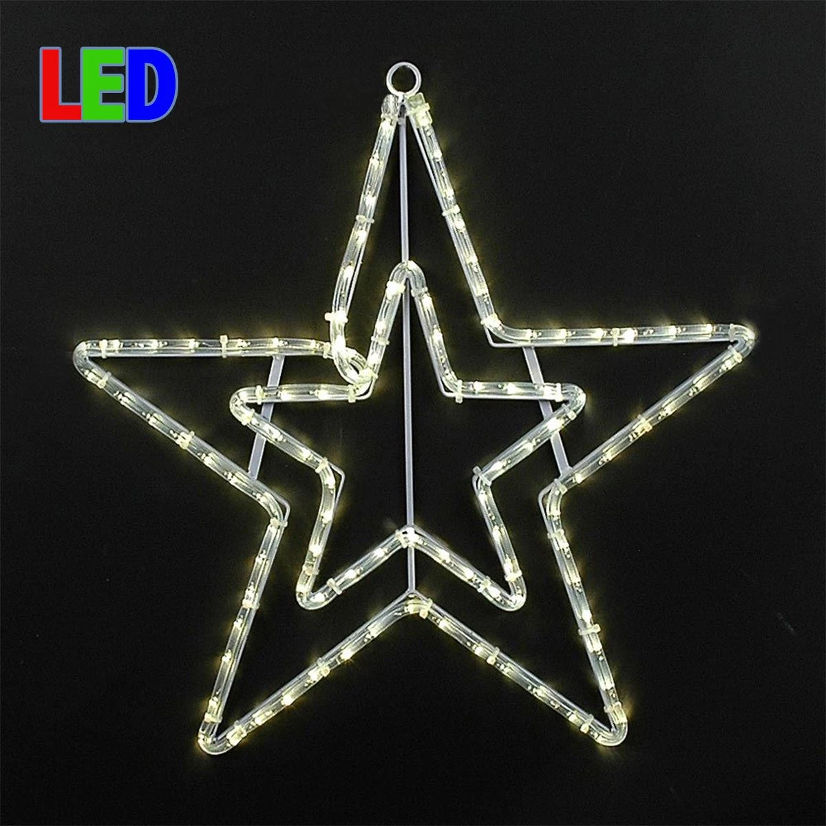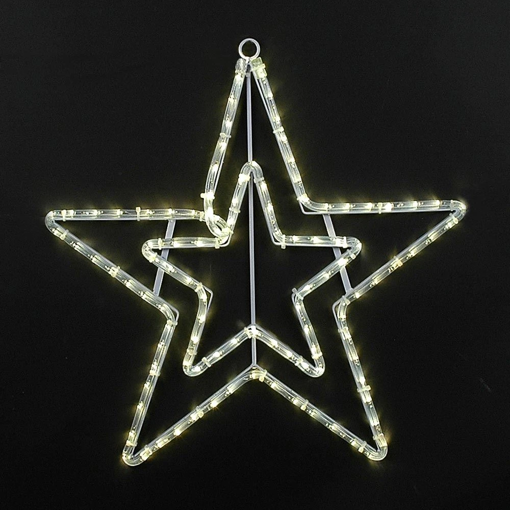 Buy our LED Rope Light Double Star sculpture to display in your home or church. Made with brilliant warm white LED rope light formed into 2 nesting stars, you can rest assured this decoration will shine bright in the darkness. Use this motif to decorate for Christmas, Easter or year-round. Constructed with UV-protected crystal clear PVC tubing and vertical LED lamps spaced every 1″ apart, these motifs are attached to a powder-coated aluminum frame that won’t rust or fade. Utilizing LED technology in our motifs means they burn cooler, use less energy, and are more durable and brighter when compared to motifs using incandescent bulbs. Each star motif comes fully assembled with a 5′ Power Cord and hanging ring, perfect for home, church, restrurant, patio, window and special event lighting. 3 season warranty. For indoor/outdoor use.
