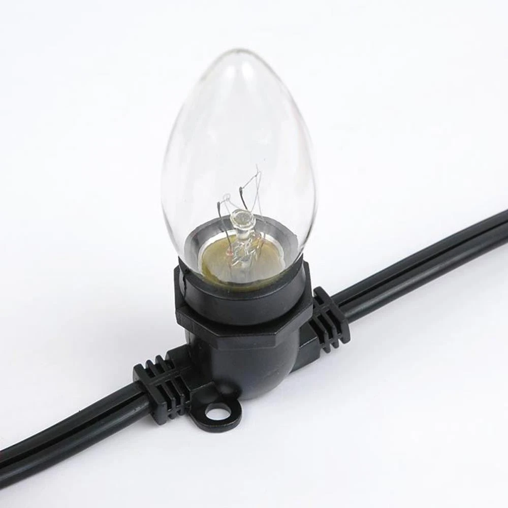 These durable and commercial light sets have 25 intermediate base sockets spaced 12″ apart on black 16 gauge Spt-2 wire. Because these strings are connectable you can string 4 sets together using 7 watt bulbs making them perfect and very versatile for permanent outdoor lighting applications. Each string comes ready to plug in and have end-to-end plugs. This product is perfect for our intermediate base S11 bulbs, our G50 incandescent or G50 LED bulbs, and our C9 LED or C9 incandescent bulbs.