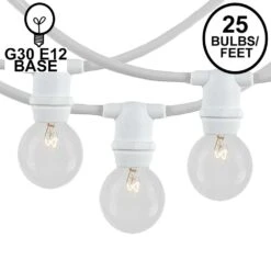 Novelty Lights, Inc. manufactures these durable and heavy duty commercial grade light sets which come with 25 candelabra base sockets spaced 12″ apart on White 16 gauge SPT-2 wire with 25 G30 Clear incandescent Bulbs. Using 5 watt per bulb, these G30 bulbs will give you years of beautiful, warm light. You can connect 6 Sets End-to-End with our 5 Watt G30 Clear Bulbs to make any install easy and convenient; you can have 150′ of patio lights on one plug! These strings are perfect for an outdoor patio, special event, restuarant, and Christmas lighting decoration. Each string comes ready to plug in; all you need to do is screw in the light bulbs. Each socket is made of PVC material to create a water tight seal around the globe bulb for extra protection against weathering.