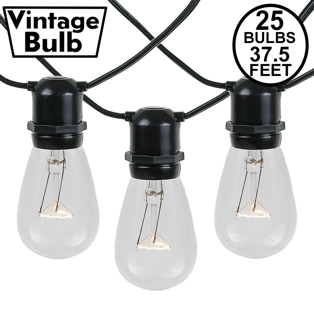 Buy Novelty Lights Clear S14 medium base bulbs string light set with 25 bulbs on 37.5′ of commerical grade black wire. These are our most durable string light sets and are sutible for year round outdoor use and permanent lighting applications. Each set includes 25 S14 medium base bulbs on a commerical grade black wire stringer with 25 sockets that are spaced 18″ apart. These clear S14 light strings have long-lasting 6000 hour bulbs and are on a heavy duty 16 gauge SPT-2 black wire stringer. Each socket is made with PVC plastic to provide a water-tight seal and to ensure no defects due to weather. These durable and heavy duty light strings will provide you with years of maintenance free use.