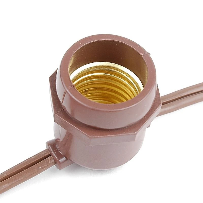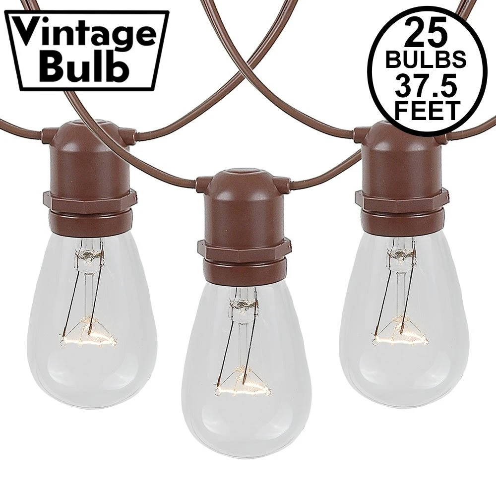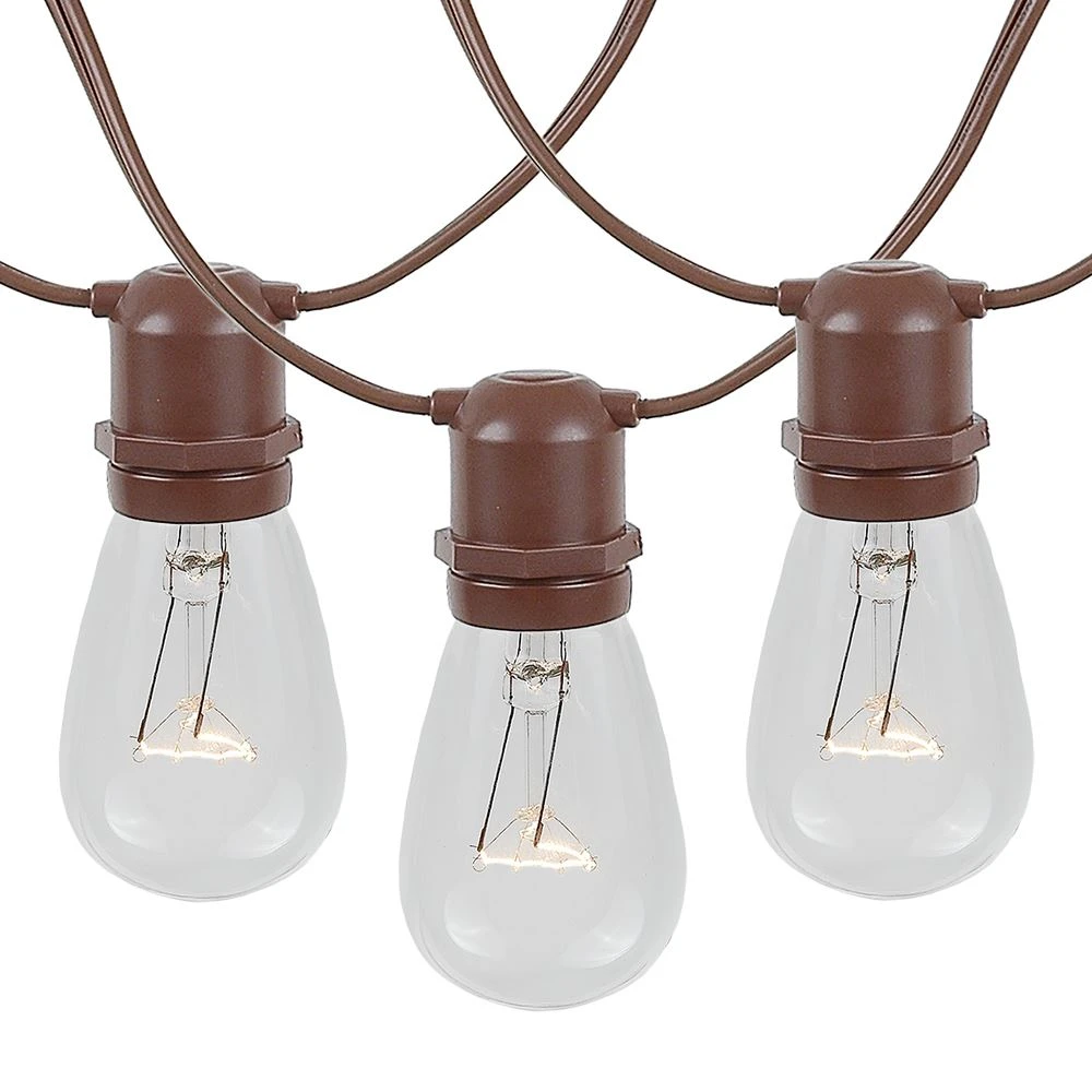 Buy Novelty Lights clear S14 medium base bulbs string light set with 25 bulbs on 37.5′ of commerical grade brown wire. These are our most durable string light sets and are sutible for year round outdoor use and permanent lighting applications. Each set includes 25 S14 medium base bulbs on a commerical grade brown wire stringer with 25 sockets that are spaced 18″ apart. These clear S14 light strings have long-lasting 6000 hour bulbs and are on a heavy duty 16 gauge SPT-2 brown wire stringer. Each socket is made with PVC plastic to provide a water-tight seal and to ensure no defects due to weather. These durable and heavy duty light strings will provide you with years of maintenance free use.