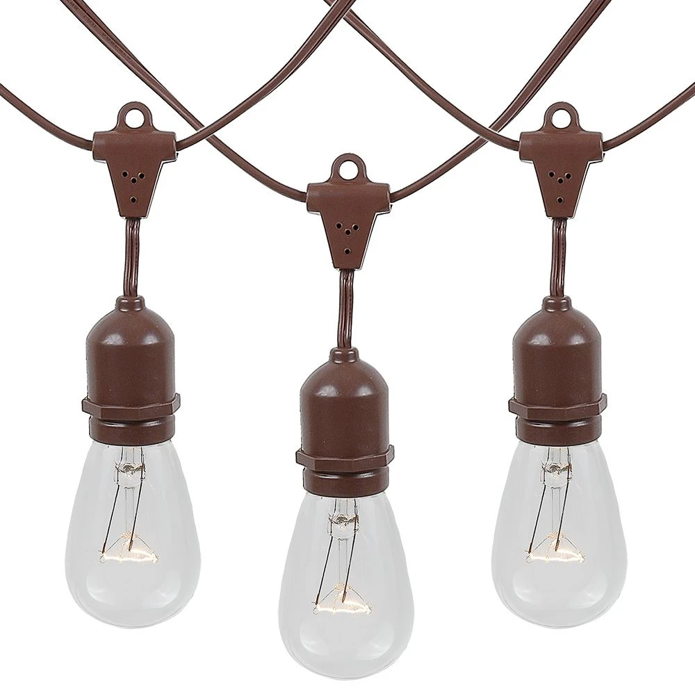 Buy Novelty Lights clear S14 medium base bulbs string light set with 25 hanging bulbs on 37.5′ of commerical grade brown wire. These are our most durable string light sets and are sutible for year round outdoor use and permanent lighting applications. Each set includes 25 S14 medium base bulbs on a commerical grade brown wire stringer with 25 suspended (hanging) sockets that are spaced 18″ apart. These clear S14 light strings have long-lasting 6000 hour bulbs and are on a heavy duty 16 gauge SPT-2 brown wire stringer. Each socket is made with PVC plastic to provide a water-tight seal and to ensure no defects due to weather. These durable and heavy duty light strings will provide you with years of maintenance free use.