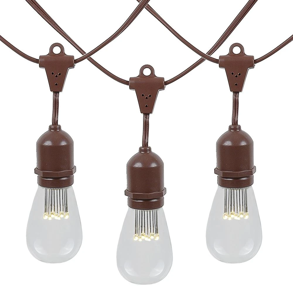 Buy Novelty Lights LED S14 warm white medium base string light set with 25 suspended bulbs on 37.5′ of commerical grade brown wire. These are our most durable string light sets and are sutible for year round outdoor use and permanent lighting applications. Each set includes 25 LED S14 medium base bulbs on a commerical grade brown wire stringer with 25 hanging (suspended) sockets that are spaced 18″ apart. These warm white S14 light strings have long-lasting 40,000 hour bulbs and are on a heavy duty 16 gauge SPT-2 brown wire stringer. These LED bulbs onlu use .80 watts, so they will certainly save you money with frequent use. Each suspended socket is made with PVC plastic to provide a water-tight seal and to ensure no defects due to weather. These durable and heavy duty light strings will provide you with years of maintenance free use.