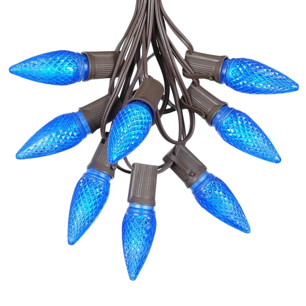 Novelty Lights Blue LED C9 string light set comes with 25 bulbs and is perfect for outdoor patios, decks, special event or Christmas lighting. Each set includes 25 bulbs on a Brown wire stringer with 25 sockets that are spaced 12″ apart. Each Blue C9 Christmas light bulb has an E17 intermediate base and 2 ultra bright SMD LED chips. Each bulb only consumes 0.80 watts (0.0067 Amps) per bulb, compared to traditional incandescent C9 bulbs that use 7 watts. These Blue C9 LED Christmas light bulbs are also housed in a hard multifaceted plastic bulb that will not fade, chip or crack. With a 3 season warranty, these LED Christmas light sets offer great energy savings and durability for an excellent value. All our C9 light strings use patented Admiral Brand sockets. Novelty Lights durable and heavy duty LED C9 light strings will provide you with years of bright and beautiful maintenance free use.