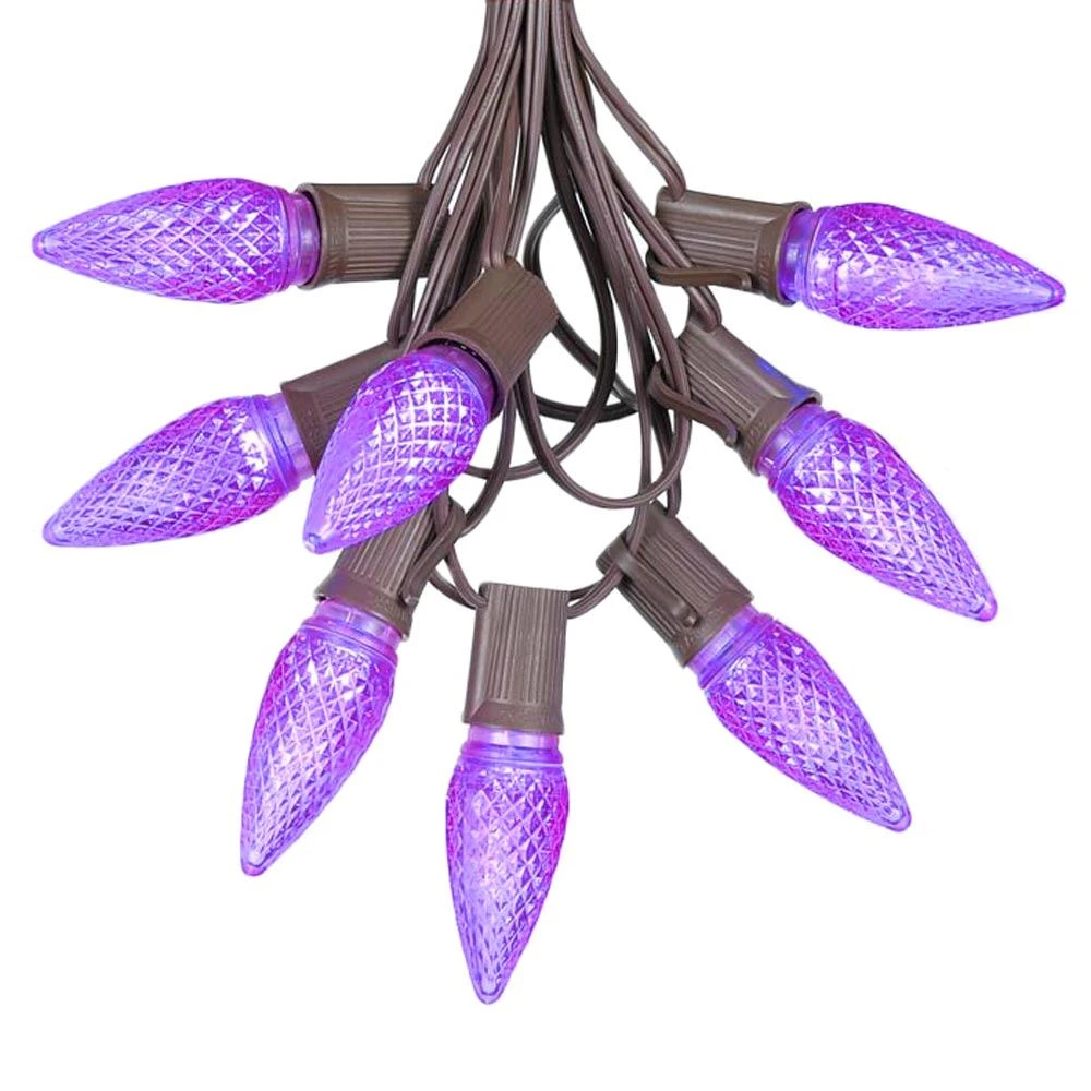 Novelty Lights Purple LED C9 string light set comes with 25 bulbs and is perfect for outdoor patios, decks, special event or Christmas lighting. Each set includes 25 bulbs on a Brown wire stringer with 25 sockets that are spaced 12″ apart. Each Purple C9 Christmas light bulb has an E17 intermediate base and 2 ultra bright SMD LED chips. Each bulb only consumes 0.80 watts (0.0067 Amps) per bulb, compared to traditional incandescent C9 bulbs that use 7 watts. These Purple C9 LED Christmas light bulbs are also housed in a hard multifaceted plastic bulb that will not fade, chip or crack. With a 3 season warranty, these LED Christmas light sets offer great energy savings and durability for an excellent value. All our C9 light strings use patented Admiral Brand sockets. Novelty Lights durable and heavy duty LED C9 light strings will provide you with years of bright and beautiful maintenance free use.