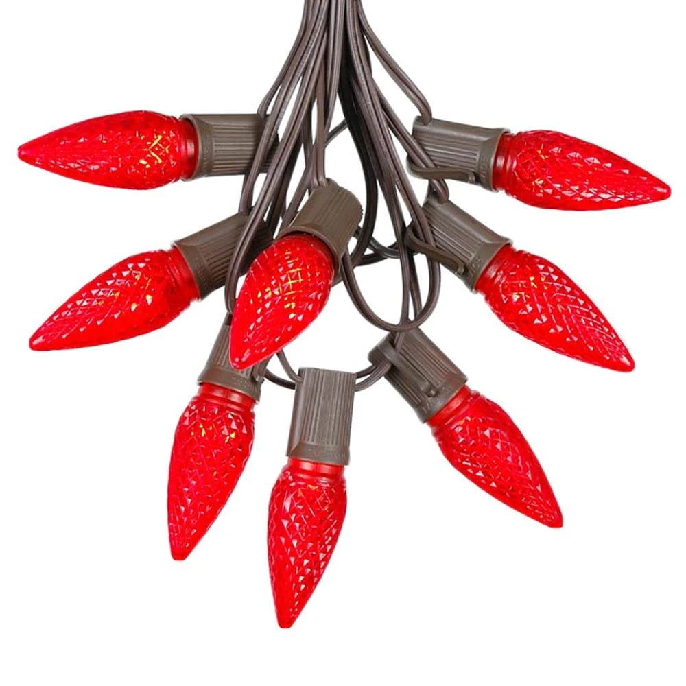 Novelty Lights Red LED C9 string light set comes with 25 bulbs and is perfect for outdoor patios, decks, special event or Christmas lighting. Each set includes 25 bulbs on a brown wire stringer with 25 sockets that are spaced 12″ apart. Each Red C9 Christmas light bulb has an E17 intermediate base and 2 ultra bright SMD LED chips. Each bulb only consumes 0.80 watts (0.0067 Amps) per bulb, compared to traditional incandescent C9 bulbs that use 7 watts. These Red C9 LED Christmas light bulbs are also housed in a hard multifaceted plastic bulb that will not fade, chip or crack. With a 3 season warranty, these LED Christmas light sets offer great energy savings and durability for an excellent value. All our C9 light strings use patented Admiral Brand sockets. Novelty Lights durable and heavy duty LED C9 light strings will provide you with years of bright and beautiful maintenance free use.