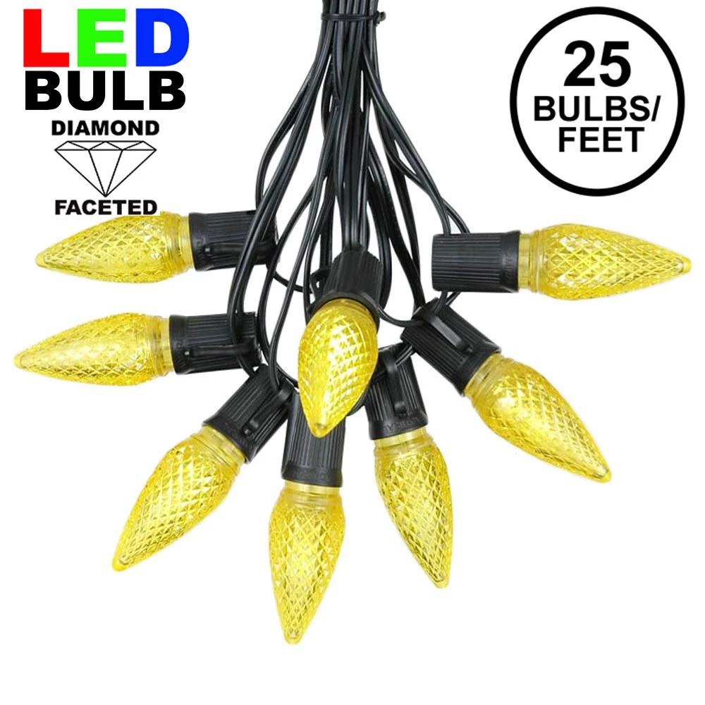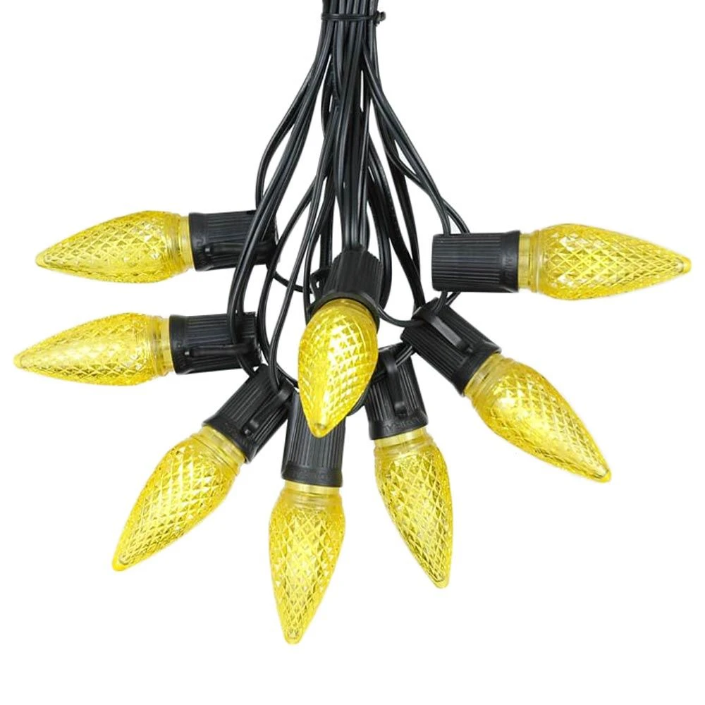 Novelty Lights Yellow LED C9 string light set comes with 25 bulbs and is perfect for outdoor patios, decks, special event or Christmas lighting. Each set includes 25 bulbs on a Black wire stringer with 25 sockets that are spaced 12″ apart. Each Yellow C9 Christmas light bulb has an E17 intermediate base and 2 ultra bright SMD LED chips. Each bulb only consumes 0.80 watts (0.0067 Amps) per bulb, compared to traditional incandescent C9 bulbs that use 7 watts. These Yellow C9 LED Christmas light bulbs are also housed in a hard multifaceted plastic bulb that will not fade, chip or crack. With a 3 season warranty, these LED Christmas light sets offer great energy savings and durability for an excellent value. All our C9 light strings use patented Admiral Brand sockets. Novelty Lights durable and heavy duty LED C9 light strings will provide you with years of bright and beautiful maintenance free use.