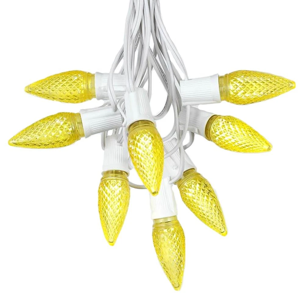 Novelty Lights Yellow LED C9 string light set comes with 25 bulbs and is perfect for outdoor patios, decks, special event or Christmas lighting. Each set includes 25 bulbs on a white wire stringer with 25 sockets that are spaced 12″ apart. Each Yellow C9 Christmas light bulb has an E17 intermediate base and 2 ultra bright SMD LED chips. Each bulb only consumes 0.80 watts (0.0067 Amps) per bulb, compared to traditional incandescent C9 bulbs that use 7 watts. These Yellow C9 LED Christmas light bulbs are also housed in a hard multifaceted plastic bulb that will not fade, chip or crack. With a 3 season warranty, these LED Christmas light sets offer great energy savings and durability for an excellent value. All our C9 light strings use patented Admiral Brand sockets. Novelty Lights durable and heavy duty LED C9 light strings will provide you with years of bright and beautiful maintenance free use.