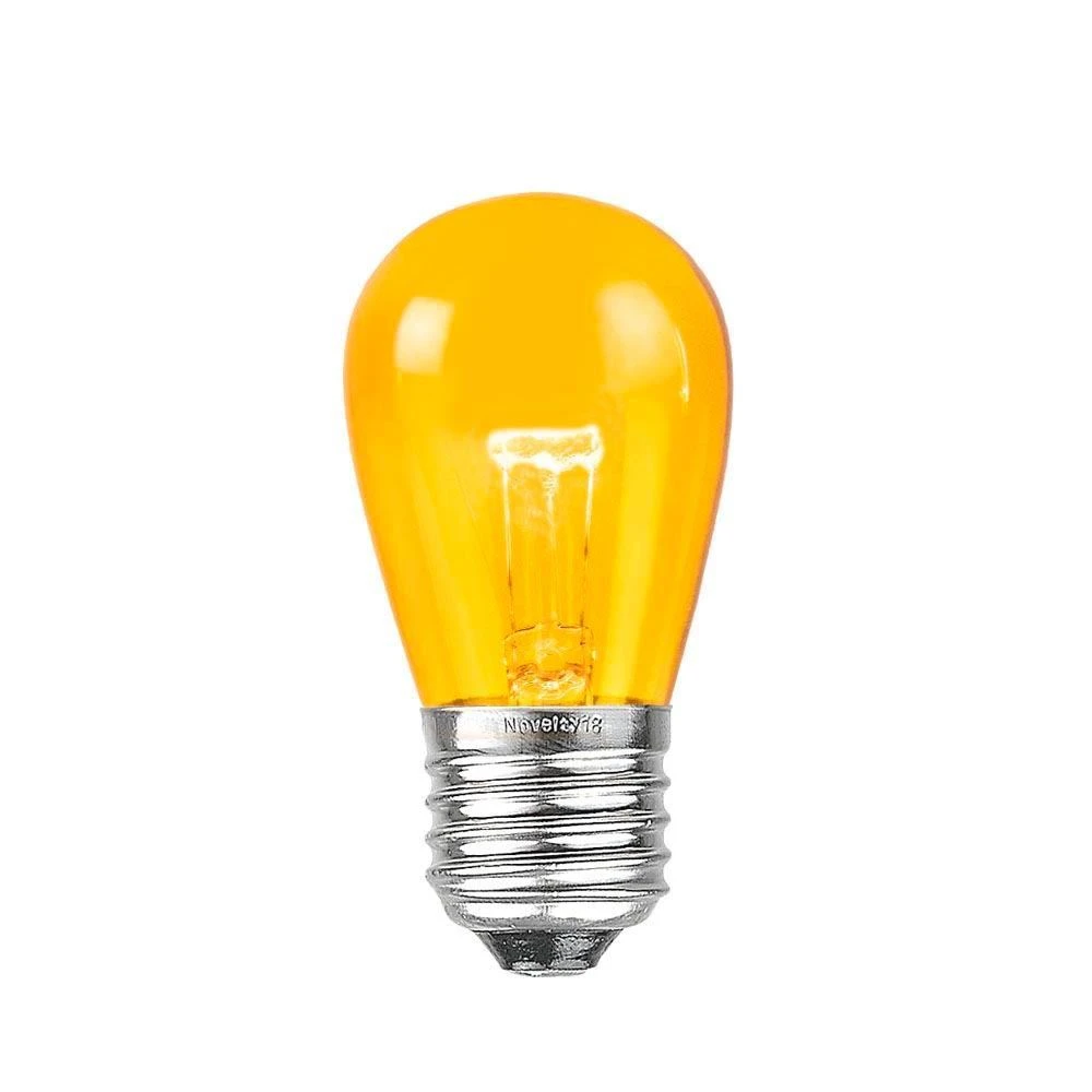 Our Transparent Yellow S14 bulbs are the perfect choice for lighting up any special occasion. Ideal for weddings, patios, awnings and creating your own backyard oasis. These Yellow bulbs are 11-watts, 130 volt and measure 3 1/2″ tall and 1 3/4″ wide with a 1” (e26) base. Our S14 bulbs can be used with our Heavy Duty Medium (e26) Stringers or any other medium base (E26) light socket. Our S14 Transparent Yellow commercial grade bulbs have a 6,000 hour life providing long term illumination for indoor and outdoor use. These bulbs are sold in packs of 25, you will qualify for a quantity discount when buying at least 10 packs of 25 bulbs.