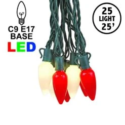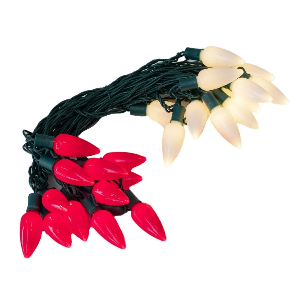 25 Lamp C9 Ceramic Red & Warm White LED String Lights Sets on Green Wire