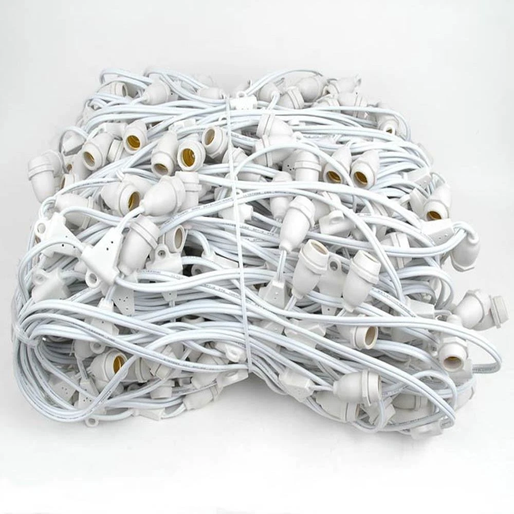 Our Heavy Duty and commercial grade light strings have 264 intermediate (e17) base sockets spaced 15″ apart on White 16 gauge Spt-2 wire. Our intermediate base outdoor light strings are very versatile making them perfect for permanent outdoor lighting applications. The maximum run is 156′ (125 sockets) using 10 watt bulbs or 222′ (178 sockets) using 7 watt bulbs. This product needs to be cut into shorter runs of less that 1250 watts. This product is perfect for our intermediate base S11 bulbs, our G50 incandescent or G50 LED bulbs, and our C9 LED or C9 incandescent bulbs.