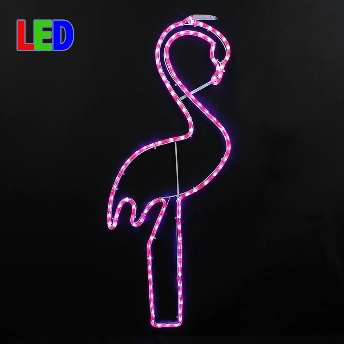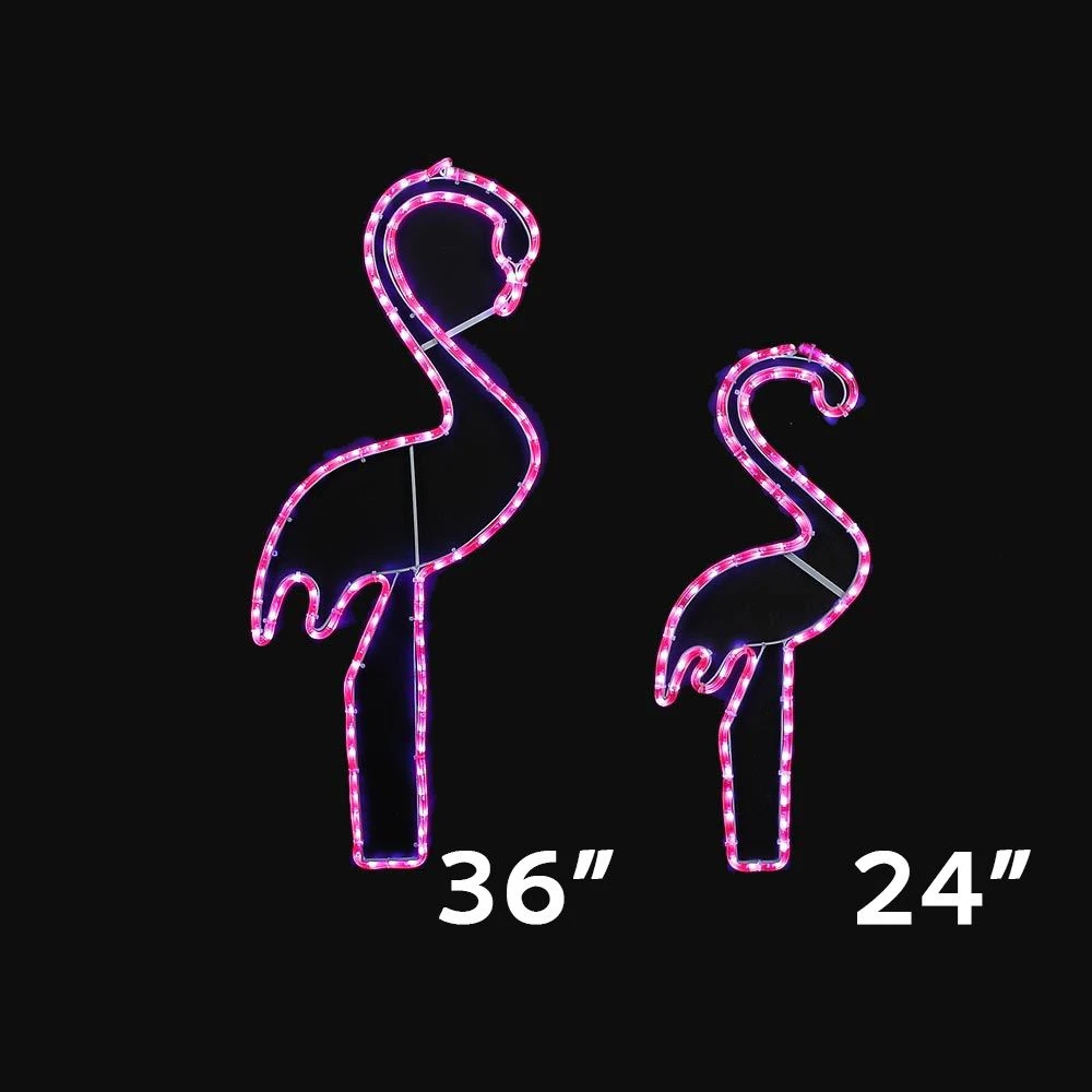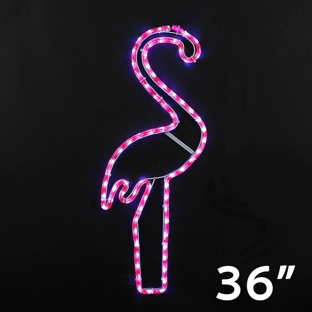 Creat a tropical diaplay in any climate with Novelty Lights Pink Flamingo LED Rope Light sculptures, available in 2 sizes. Made with brilliant pink LED rope light, you can rest assured these pink flamingos will shine bright in the darkness. Constructed with UV-protected crystal clear PVC tubing and vertical LED lamps spaced every 1″ apart, these motifs are attached to a powder-coated aluminum frame that won’t rust or fade. Utilizing LED technology in our motifs means they burn cooler, use less energy, and are more durable and brighter when compared to motifs using incandescent bulbs. Each cross motif comes fully assembled with a 5′ Power Cord and hanging ring, perfect for home, restrurant, patio, window and special event lighting. 3 season warranty. For indoor/outdoor use.