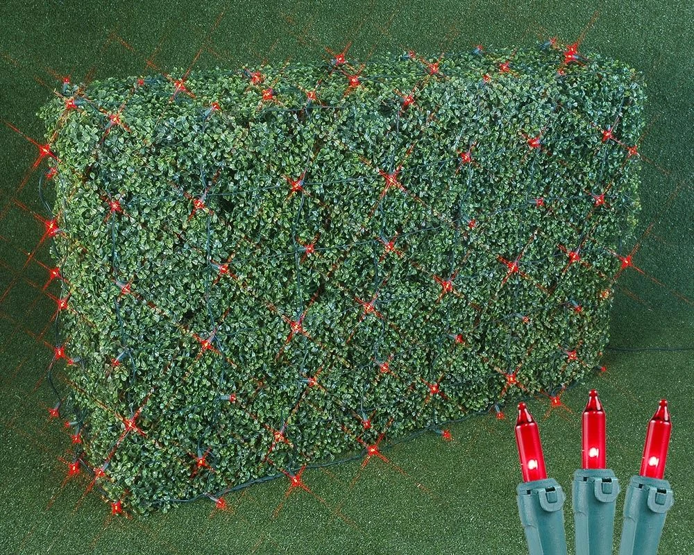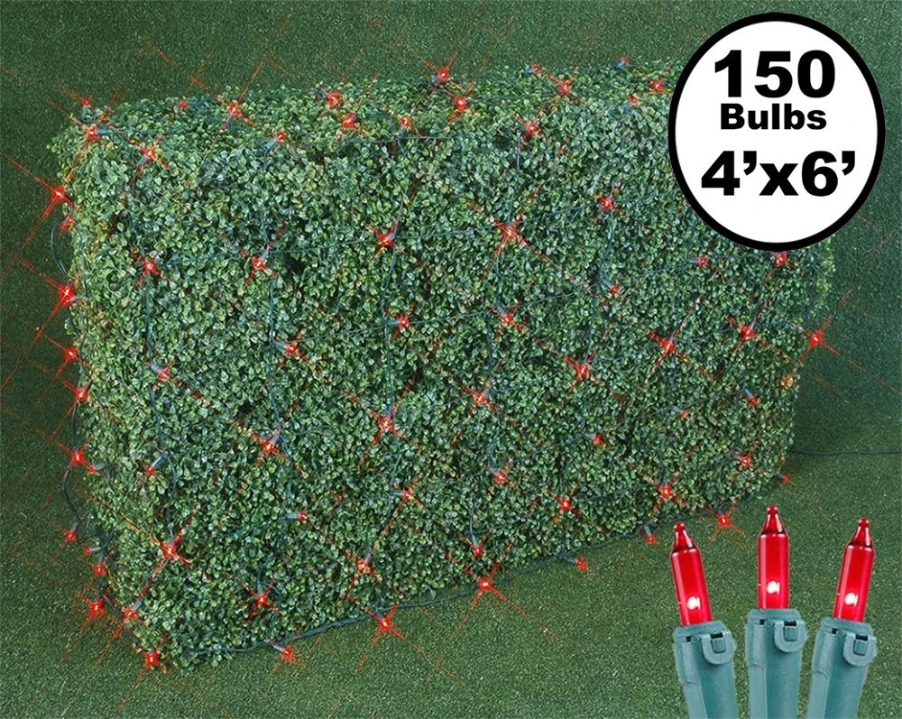 Our 4′ x 6′ Incandescent Red Net Lights on Green wire are perfect for decorating hedges and shrubs and wrapping trees. These Green wire net lights are constructed using 150 mini lights to make our net lights brighter than regular net lights — and If one light burns out the rest will stay lit. Choose net lights for quick installation and connect up to 3 net lights together for larger surfaces. Each net light purchase includes 3 replacement bulbs.