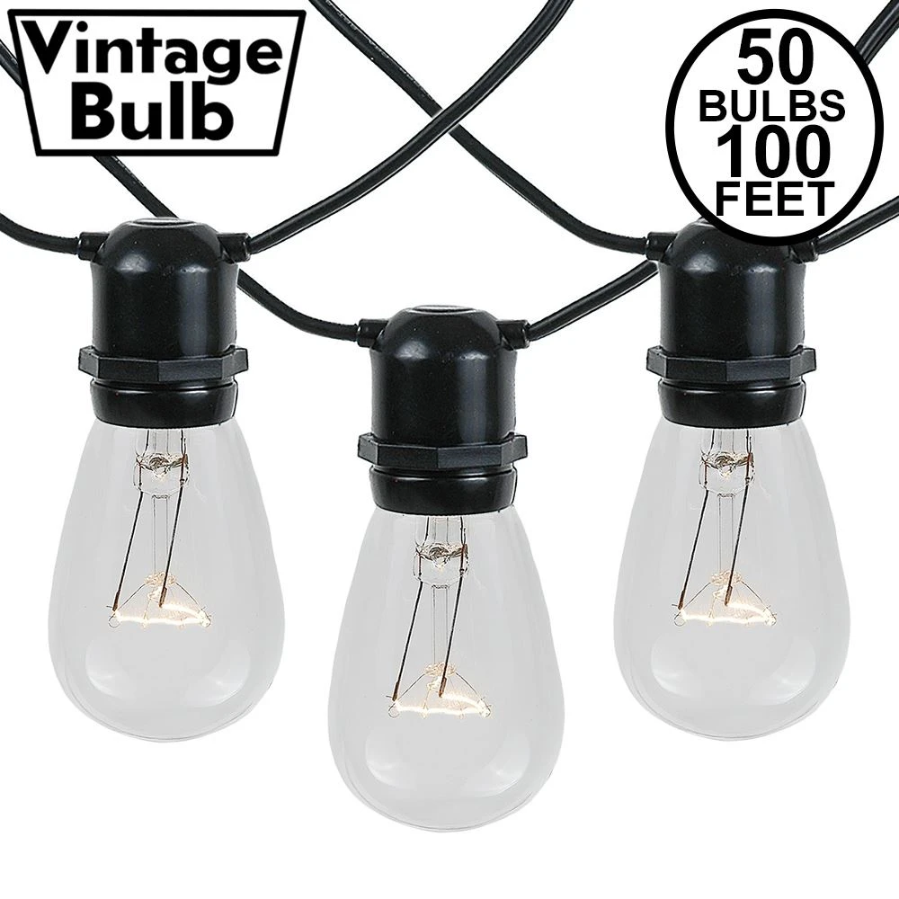 Buy Novelty Lights clear S14 medium base bulbs string light set with 50 bulbs on 100′ of commerical grade black wire. These are our most durable string light sets and are sutible for year round outdoor use and permanent lighting applications. Each set includes 50 S14 medium base bulbs on a commerical grade black wire stringer with 50 sockets that are spaced 24″ apart. These clear S14 light strings have long-lasting 6000 hour bulbs and are on a heavy duty 16 gauge SPT-2 black wire stringer. Each socket is made with PVC plastic to provide a water-tight seal and to ensure no defects due to weather. Each string in not connectable end-to-end. These durable and heavy duty light strings will provide you with years of maintenance free use.