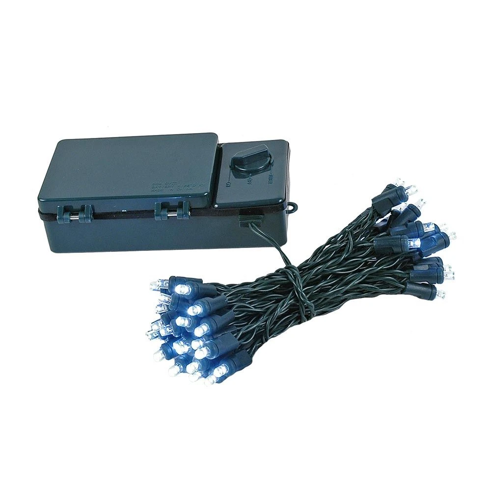 50 LED Pure White Battery powered Christmas light string for holiday and special event lighting when there is no power supply. These super bright battery operated LED lights have 50 wide angle pure white lights that run on 3 D batteries(not included). Our 50 LED battery operated lights are built to last using a weatherproof battery case with clamps making these units perfect for outdoor use. Each unit also comes with an optional timer function. Simply turn the timer on when you want the lights to come on. Once the timer is set the lights will come on at the same time every day and stay on for 6 hours lasting up to 2 weeks on a good set of batteries. Ideal for decorating where power is unavailable or simply getting rid of the extension cords.