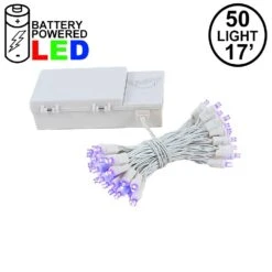 50 LED Purple Battery powered Christmas light string for holiday and special event lighting when there is no power supply. These super bright battery operated LED lights have 50 wide angle purple lights that run on 3 D batteries(not included). Our 50 LED battery operated lights are built to last using a weatherproof battery case with clamps making these units perfect for outdoor use. Each unit also comes with an optional timer function. Simply turn the timer on when you want the lights to come on. Once the timer is set the lights will come on at the same time every day and stay on for 6 hours lasting up to 2 weeks on a good set of batteries. Ideal for decorating where power is unavailable or simply getting rid of the extension cords.