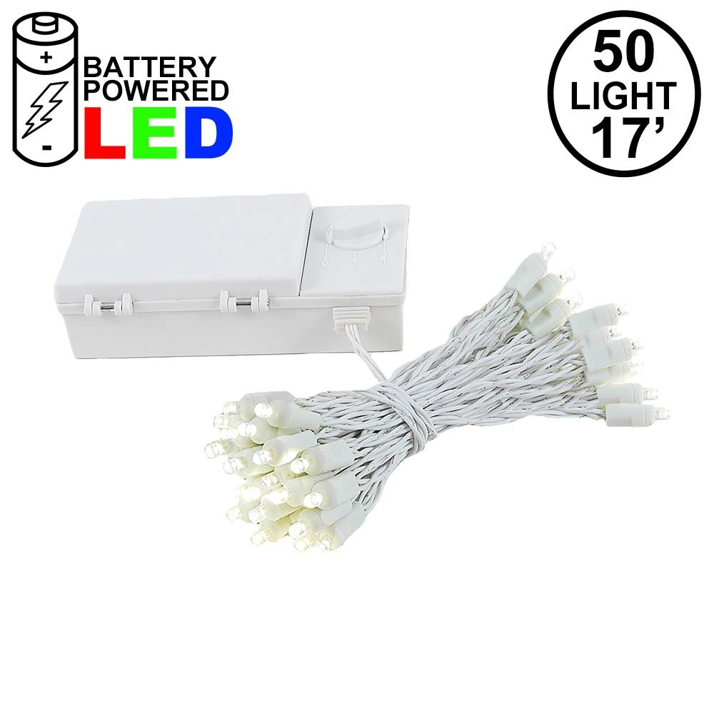 50 LED Warm White Battery powered Christmas light string for holiday and special event lighting when there is no power supply. These super bright battery operated LED lights have 50 wide angle warm white lights that run on 3 D batteries(not included). Our 50 LED battery operated lights are built to last using a waterproof battery case with clamps making these units perfect for outdoor use. Each unit also comes with an optional timer function. Simply turn the timer on when you want the lights to come on. Once the timer is set the lights will come on at the same time every day and stay on for 6 hours lasting up to 2 weeks on a good set of batteries. Ideal for decorating where power is unavailable or simply getting rid of the extension cords.