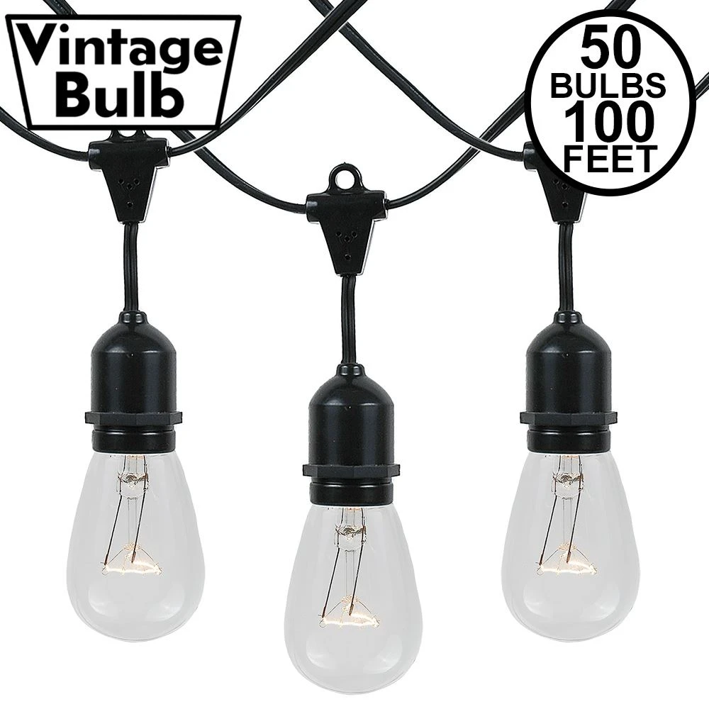 Buy Novelty Lights clear S14 medium base bulbs suspended string light set with 50 bulbs on 100′ of commerical grade black wire. These are our most durable string light sets and are sutible for year round outdoor use and permanent lighting applications. Each set includes 50 S14 medium base bulbs on a commerical grade black wire stringer with 50 hanging (suspenede) sockets that are spaced 24″ apart. These clear S14 light strings have long-lasting 6000 hour bulbs and are on a heavy duty 16 gauge SPT-2 black wire stringer. Each suspended socket is made with PVC plastic to provide a water-tight seal and to ensure no defects due to weather. Each string in not connectable end-to-end. These durable and heavy duty light strings will provide you with years of maintenance free use.