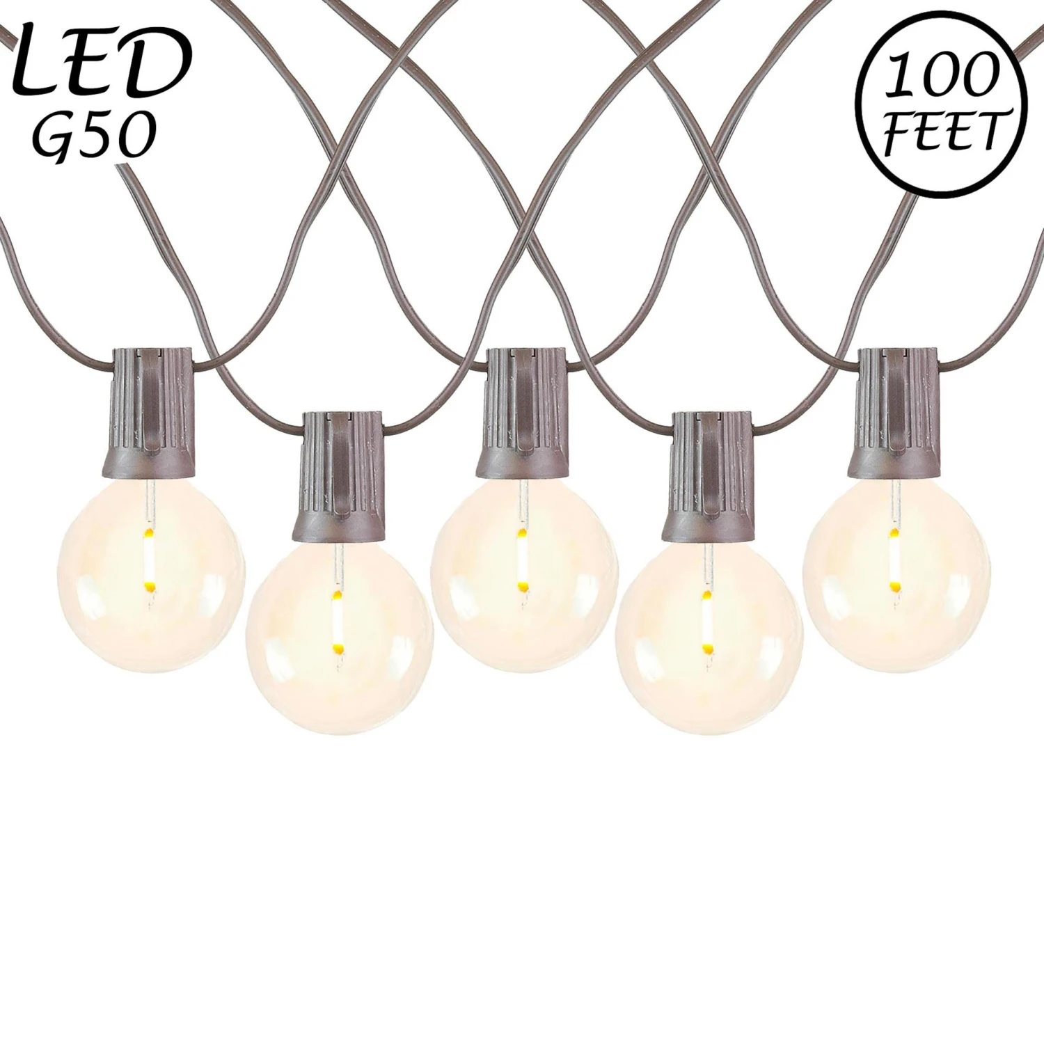 Novelty Lights Warm White LED Fialment G50 globe string light sets with 67 bulbs, perfect for illuminating your outdoor garden, patio, deck, yard, or special event space. Each set includes 69 (2 extra) round shatterproof plastic G50 globe bulbs and a 100 foot Brown wire stringer with 67 sockets that are spaced 18″ apart. String together up to 10 sets to meet the needs of your particular application. These Warm White LED G50 globe light strings have long-lasting 10,000 hour bulbs and are on a 20 gauge Brown wire. These durable and heavy duty light strings will provide you with years of maintenance-free use.