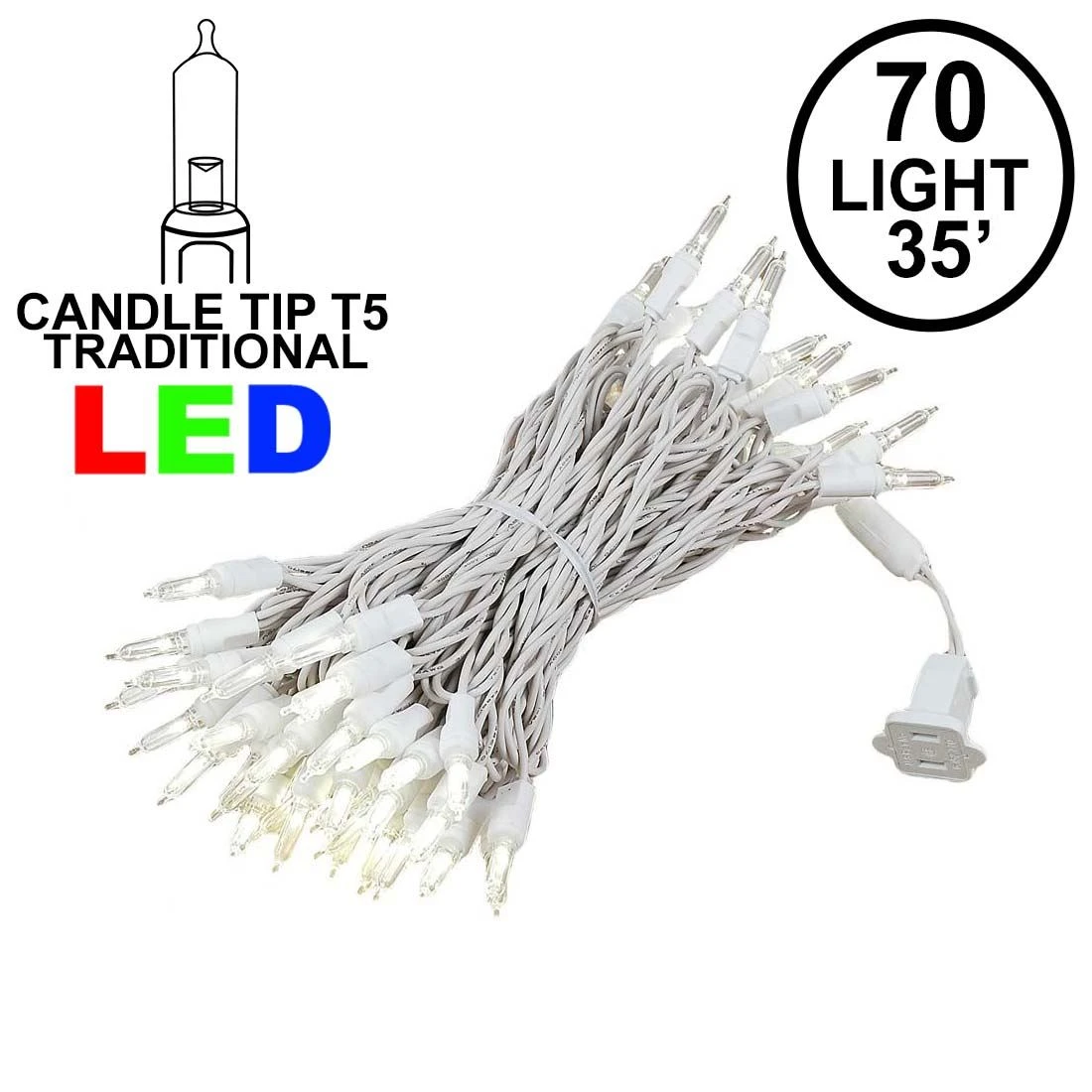 Traditional 70 light warm white LED Christmas light light on White wire with candle tip LED bulbs. These traditional LED Christmas light have the same look and feel as standard incandescent mini lights because they have the same shape and brightness but they use long lasting and energy efficient LED’s. These long lasting LED Christmas lights are perfect for projects requiring shorter light sets with 6″ bulb spacing. All our warm white Christmas lights are UL Listed for indoor and outdoor use.