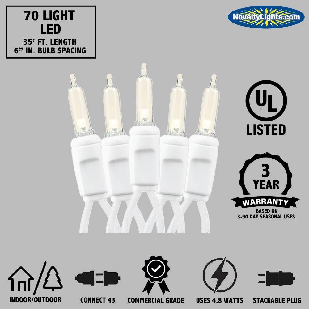 70 Light Traditional LED Christmas Mini Lights Warm White on White Wire
