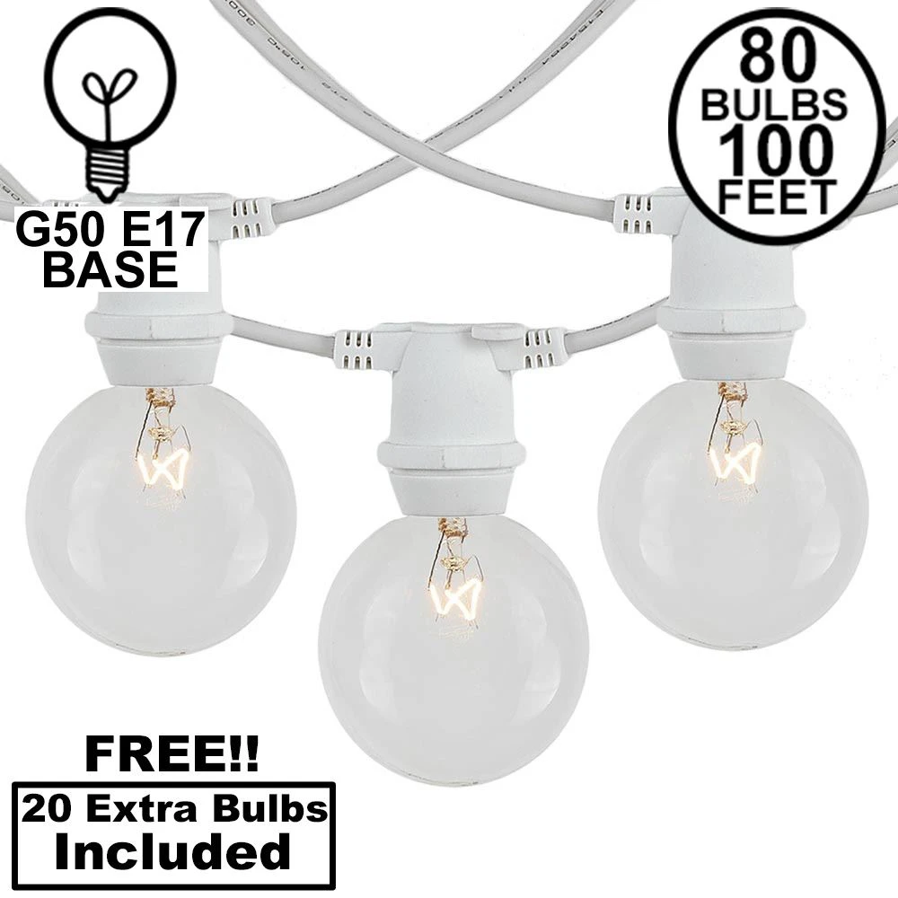 Novelty Lights, Inc. manufactures these durable and heavy duty commercial grade light sets which come with 80 intermediate base sockets spaced 15″ apart on White 16 gauge SPT-2 wire with 100 G50 Clear Bulbs. Each set comes with 20 extra bulbs. This set is not connectable end to end. These strings are perfect for an outdoor patio, special event, restuarant, and Christmas lighting decoration. Each string comes ready to plug in; all you need to do is screw in the light bulbs. Each socket is made of PVC material to create a water tight seal around the globe bulb for extra protection against weathering.