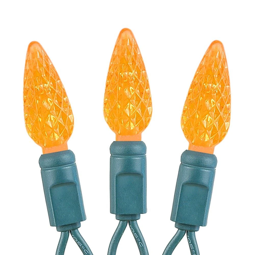 Our 70 light Commercial Grade Amber C6 LED Strawberry Lights are sure to brighten up any holiday display or special event. These high quality LED Christmas light sets are built using nonremovable high quality super bright LED’s that will last several years. Because these sets use one-piece non-removable bulbs, failures due to broken, damaged, removed, or burnt-out bulbs, are eliminated. These Amber LED mini light strings have 70 LED’s spaced every 4″ making them 24′ long. Our C6 LED mini Christmas lights have high quality, built-in, full wave rectifiers, making them extremely bright without any flicker. Connect up to 43 strings end-to-end. UL Listed for indoor and outdoor use and Energy Star qualified.