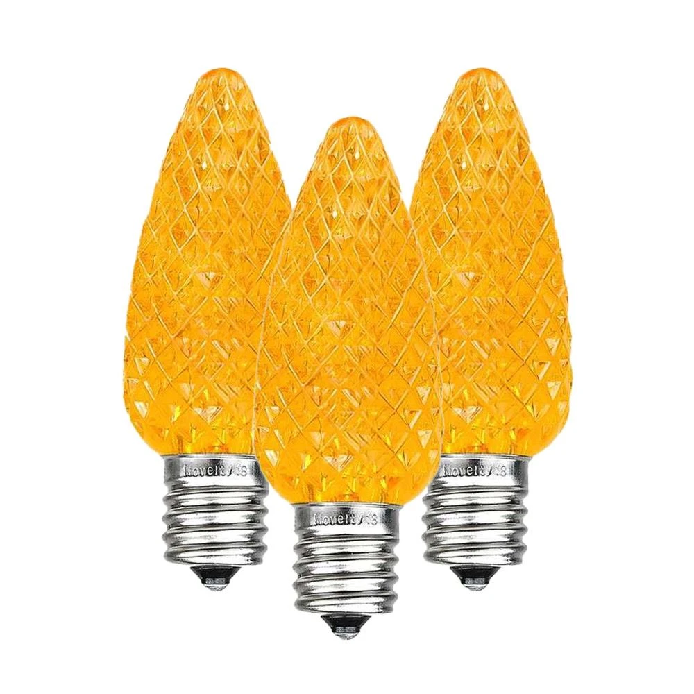 Amber/Orange Diamond Bright Faceted C9 Retrofit replacement lamps. Our brilliant Amber/Orange C9 retrofit bulbs utilize a Super Bright 2 SMD LED creating evenly distributed vivid bright C9 LED. We also use a thick plastic polycarbonate providing a durable LED C9 that will not chip, fade or crack. We also use a special diamond cut prism on the outside of all our Retro-fit bulbs creating brilliant lighting effects. These SMD C9’s are also dimmable making them perfect for animated displays. All of our LED C9’s are energy efficient using only 0.80 Watts and 0.0067 Amps. Built to last with a 3 season warranty. Our C9 Diamond Faceted LED bulbs will provide years of quality use. Perfect for seasoned Christmas light installers, yet easy for anyone to decorate roof lines, trees, buildings, walkways and porches. Switch out those old incandescent C9 bulbs that consume too much energy and break all the time for our energy efficient Retro-fit C9’s utilizing 2 super bright SMD LED technology. Our LED C9 Diamond Faceted bulbs can be used with our C9 stringers (100′, 25′, 12.5′ & 10′), as well as our commercial grade C9 Bulk Spools and our Vintage Twisted Wire Strings with E17 Bakelite Sockets.