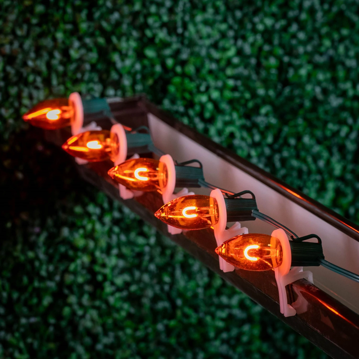 Novelty Lights Amber(Orange) C9 U-Shaped Flexible Filament LED Plastic Filament Retrofit replacement lamps, utilize a Flexible(U-Shaped) Filament design for veiwing from all angles. Switch out those old incandescent C9 bulbs that consume too much energy and break all time for our energy efficient Retro-fit C9’s utilizing LED filament technology. Our bulbs are made of a quality plastic providing a durable LED C9 that will not chip, fade or crack. These Amber(Orange) C9’s are also dimmable making them perfect for animated displays. All of our LED C9’s are energy efficient using only 1 Watts per bulb. Built to last with a 2 season warranty. Our C9 plastic filament LED bulbs will provide years of quality use. Perfect for seasoned Christmas light installers, yet easy for anyone to decorate roof lines, trees, buildings, walkways and porches. Our LED C9 plastic filament LED bulbs can be used with our C9 stringers (100′, 25′, 12.5′ & 10′), as well as our commercial grade C9 Bulk Spools and our Vintage Twisted Wire Strings with E17 Bakelite Sockets.