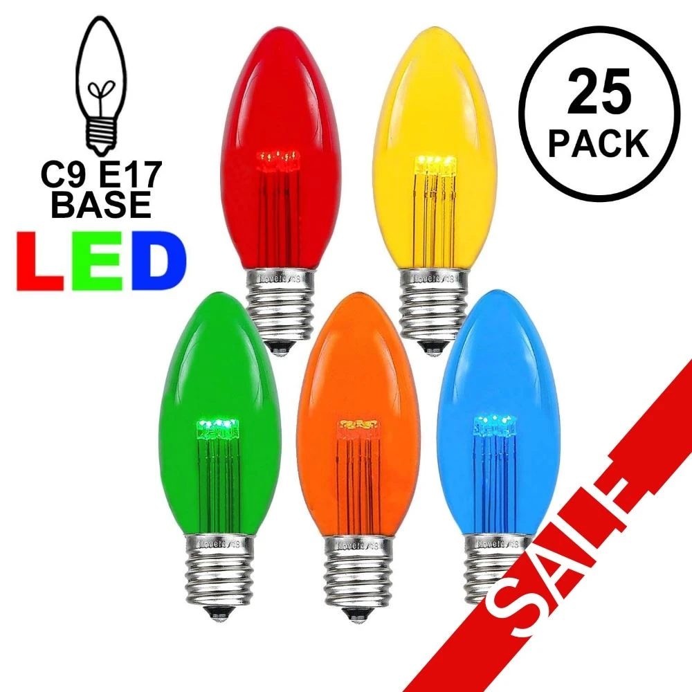Novelty Lights C9 Assorted smooth glass LED bulbs with 5 super bright and energy efficient LEDs will bring beauty to your next decorating project. The C9 glass bulb, unlike it’s incandescent counter-parts, will not get hot, giving you more options for indoor and outdoor applications! The C9 Glass Multi Colored bulbs will bring that traditional and classic look to your roofline, trees, backyard BBQ or other Holiday installation without the added cost. The C9 glass bulbs have a 3 season; 40,000 hour warranty. Our Assorted glass C9 bulbs can be used with any of our C9 Stringers (10’, 12.5’, 25′ & 100′), our E17 Heavy Duty Light Strings (25′, 100′ & 330′), our commercial grade bulk C9 Bulk spools as well as our vintage Twisted Wire Strings with E17 Bakelite Sockets.