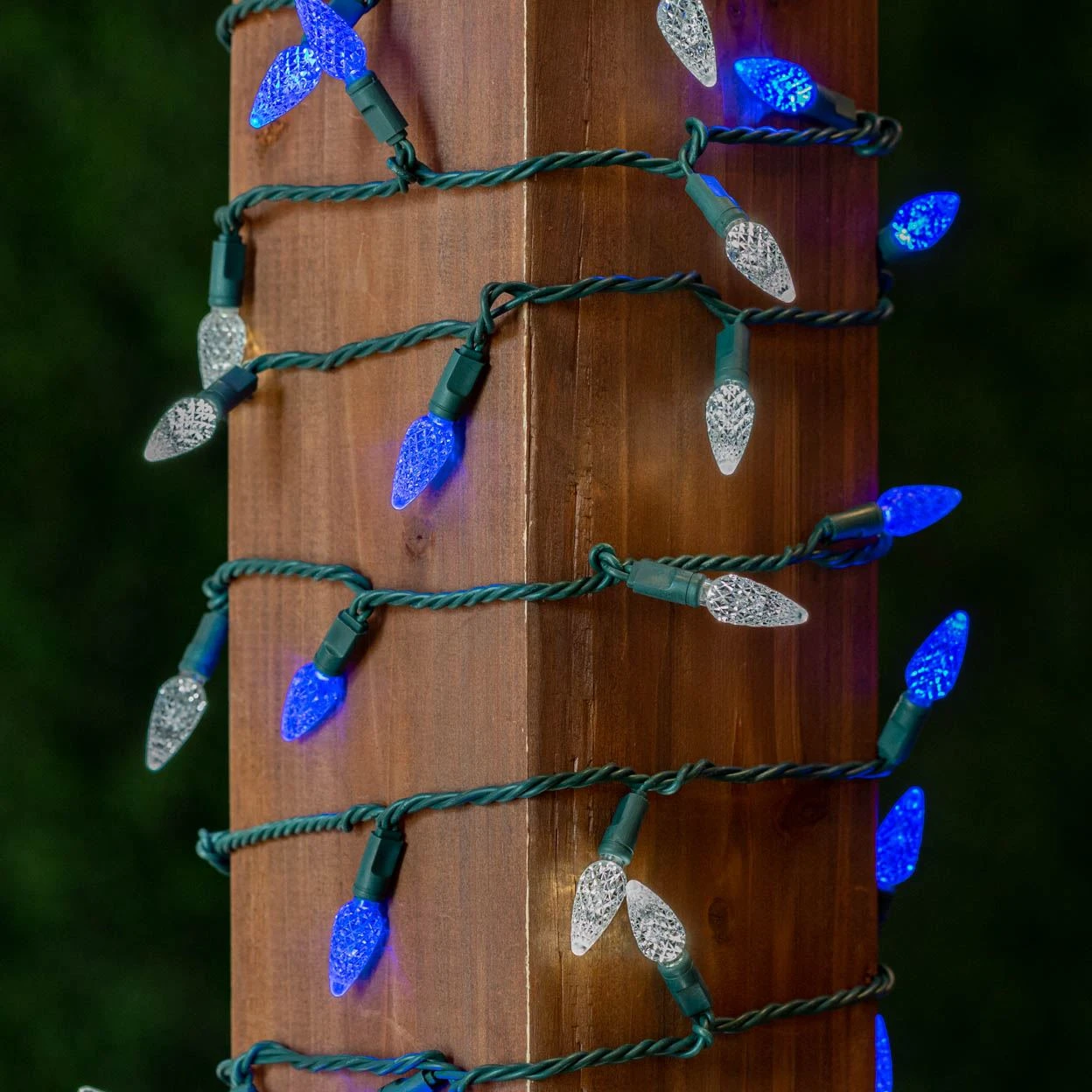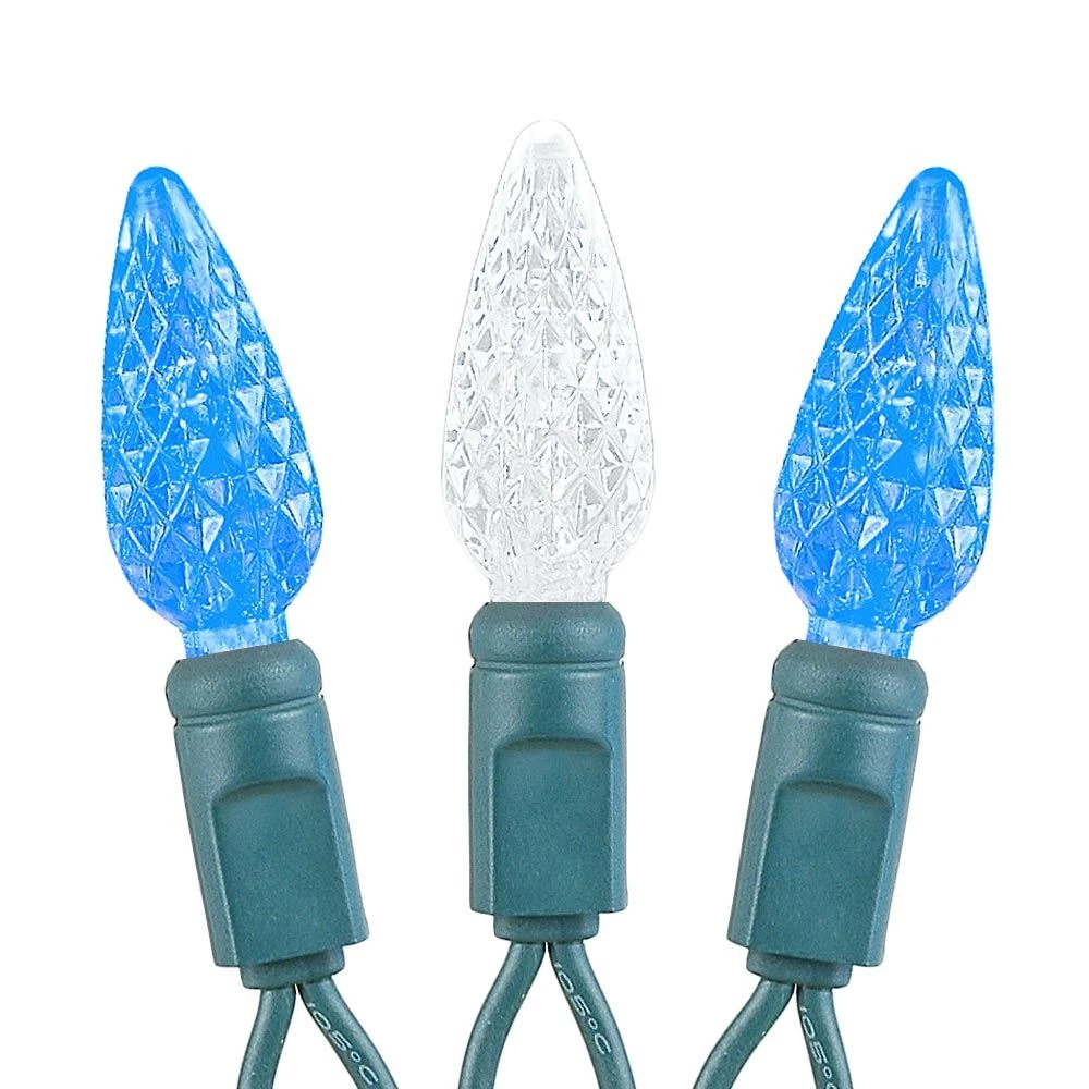Our 70 light Commercial Blue and White C6 LED Strawberry Lights are sure to brighten up any holiday display or special event. These high quality LED Christmas light sets are built using nonremovable high quality super bright LED’s that will last several years. Because these sets use one-piece non-removable bulbs, failures due to broken, damaged, removed, or burnt-out bulbs, are eliminated. These Blue and White LED mini light strings have 70 LED’s spaced every 4″ making them 24′ long. Our C6 LED mini Christmas lights have high quality, built-in, full wave rectifiers, making them extremely bright without any flicker. Connect up to 43 strings end-to-end. UL Listed for indoor and outdoor use and Energy Star qualified.
