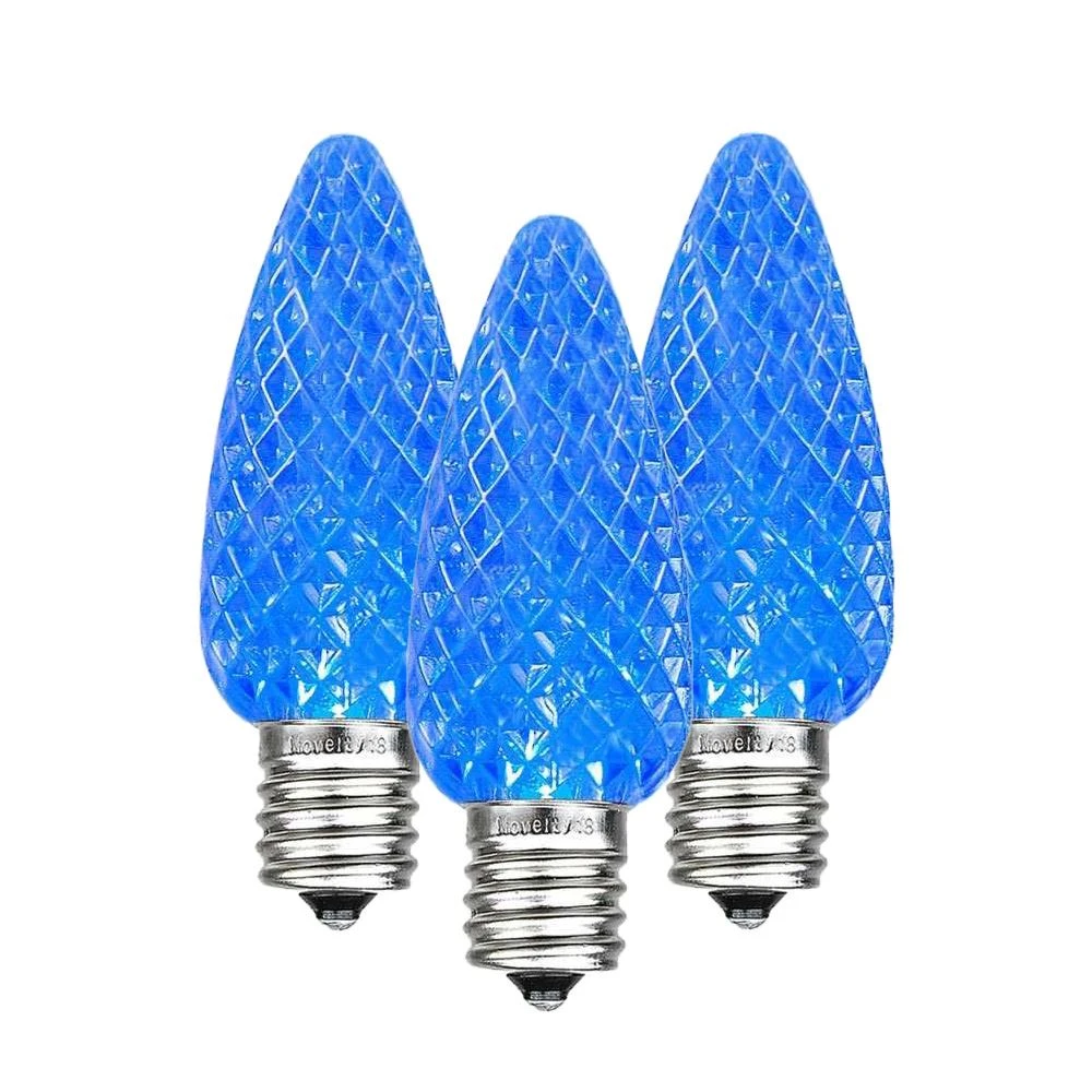 Blue Diamond Bright Faceted C9 Retrofit replacement lamps. Our brilliant Blue C9 retrofit bulbs utilize a Super Bright 2 SMD LED creating evenly distributed vivid bright C9 LED. We also use a thick plastic polycarbonate providing a durable LED C9 that will not chip, fade or crack. We also use a special diamond cut prism on the outside of all our Retro-fit bulbs creating brilliant lighting effects. These SMD C9’s are also dimmable making them perfect for animated displays. All of our LED C9’s are energy efficient using only 0.80 Watts and 0.0067 Amps. Built to last with a 3 season warranty. Our C9 Diamond Faceted LED bulbs will provide years of quality use. Perfect for seasoned Christmas light installers, yet easy for anyone to decorate roof lines, trees, buildings, walkways and porches. Switch out those old incandescent C9 bulbs that consume too much energy and break all the time for our energy efficient Retro-fit C9’s utilizing 2 super bright SMD LED technology. Our LED C9 Diamond Faceted bulbs can be used with our C9 stringers (100′, 25′, 12.5′ & 10′), as well as our commercial grade C9 Bulk Spools and our Vintage Twisted Wire Strings with E17 Bakelite Sockets.
