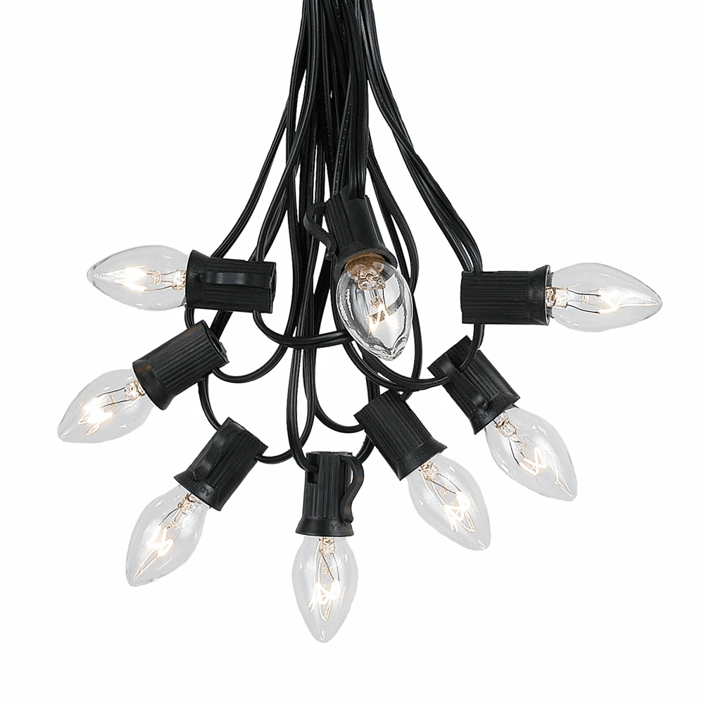Create a Shimmering glow to your Holiday display with Novelty Lights Clear Twinkling C7 string light set. Our Red Twinkling C7 light set is perfect for outdoor patios, decks, indoor/outdoor special events and Holiday lighting. Each set includes 25 Clear Twinkling 7 watt bulbs, 130 volt with a candelabra (e12) base, the bulbs have a 3000 hour or 2 season warranty. The 25’ Black C7 string is made with 25 Admiral brand sockets spaced 12” apart. The deluxe package includes an extra box of 25 bulbs at an excellent value. Our durable and heavy duty strings will provide you with years of maintenance free use.