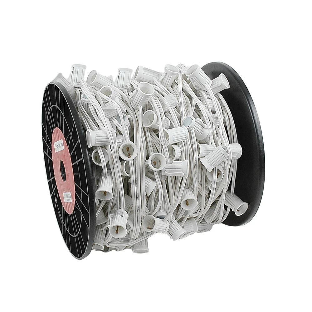 C7 250′ Spool Magnetic string on 12″ Spacing used for homes, office buildings, barns, and restaurants. These magnetic sockets will adhere to any ferrous metals(Iron and Steel) making for quick installations since there in no need for christmas light clips. Perfect for rooflines, building flashing, and gutters. No need for screws, glues, clips just adhere the magnetic C7 socket to you metall surface saving time and labor cost. We use Neodymium grade magnets which are the strongest magnets available. Each magnet is is plated with nickel protective coating which prevent rust. Use this 250-foot, White wire stringer for C7 incandescent, C7 retrofit LED, G30, G40 globe-shaped bulbs. Safe for indoor and outdoor use.